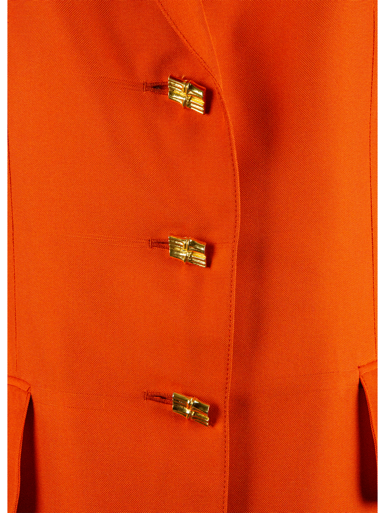 A burnt orange Hermès single-breasted blazer. This long single-breasted blazer features a notched lapel with a decorative buttonhole on the right side. Just below the lapel are three gold-coloured buttons in the shape of two-piece of bamboo. At the front of the blazer are three pockets; One on the left-hand side on the bust, the further two at the bottom of the blazer that runs from the hip towards the hem, covered with flaps of burnt orange material that runs throughout the blazer. Two darts run up from the pockets to the bust, shaping the blazer. With shoulder pads for structure, the sleeves fall down and are adorned with the same golden bamboo buttons on the cuffs. On the sides of the centre back seams are two more tailoring seams that further shape the blazer. Within the blazer is a silk lining in the same colour as the blazer with the Hermès Paris house logo in a geometric pattern.