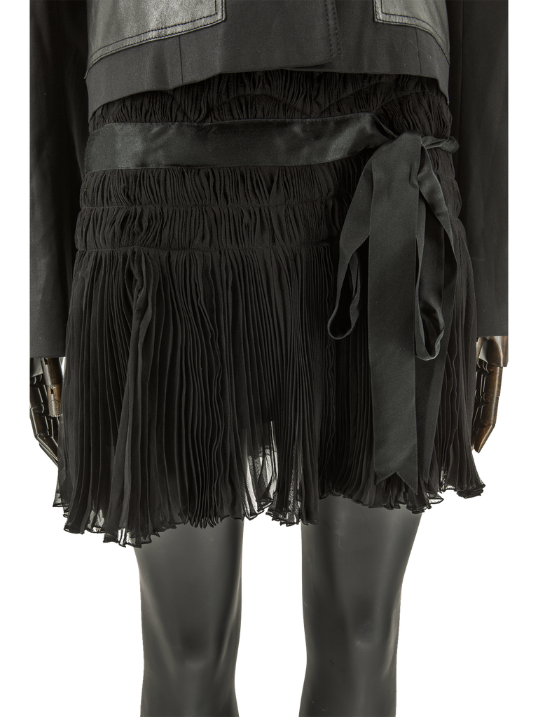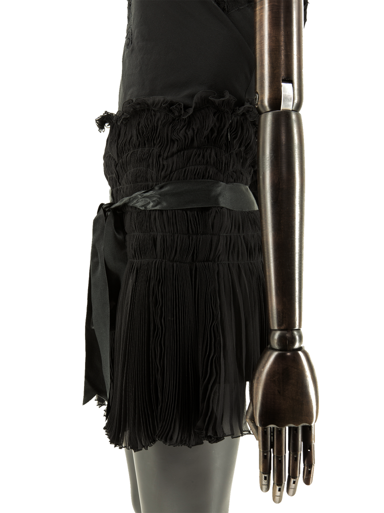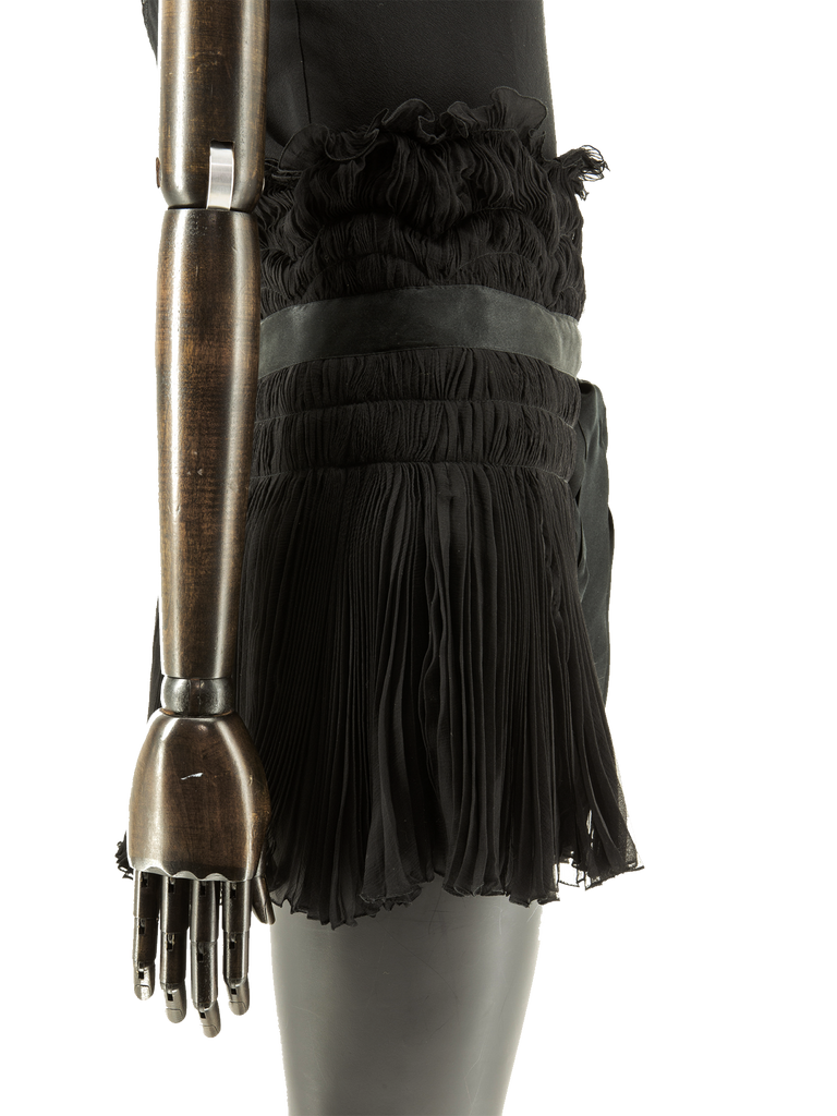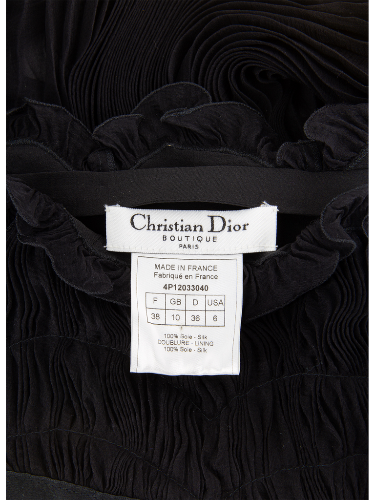 A mid 1990’s Christian Dior Boutique black fine silk chiffon mini-skirt, in a sun-ray pleated design, featuring a ruched stitched-down detail in a linear and wave form, with scalloped edge, finished with a self gently-eased border and satin trim with asymmetric grown-on ties at hip, fully mounted on black fine silk georgette, all attached to a black self-covered inner waistband. This item carries the Christian Dior Boutique authenticity label.