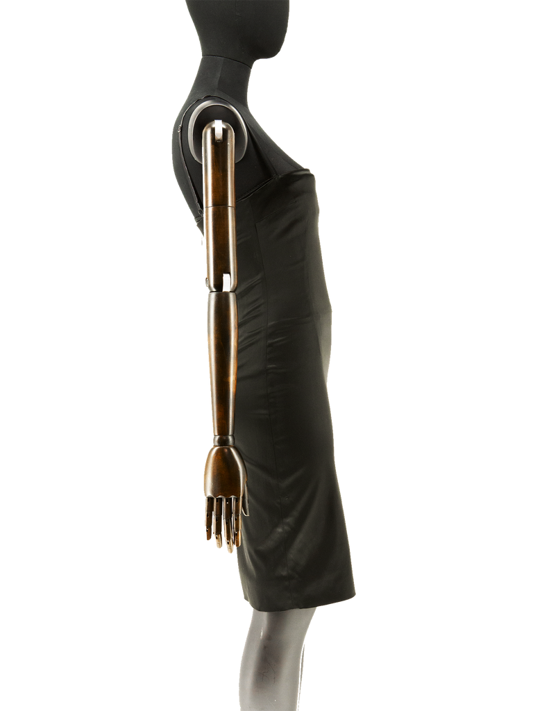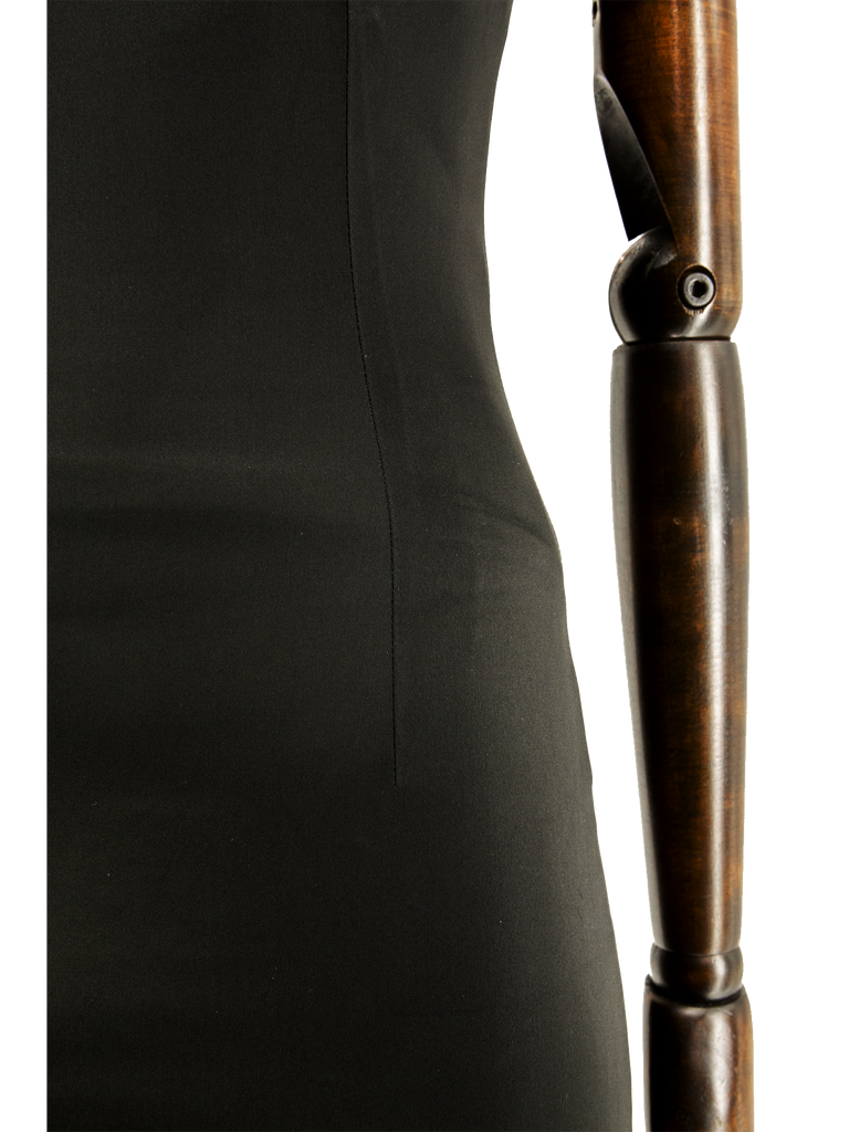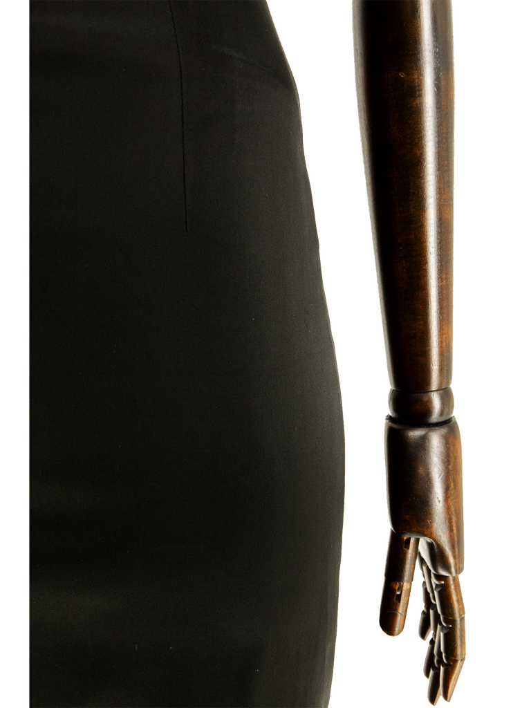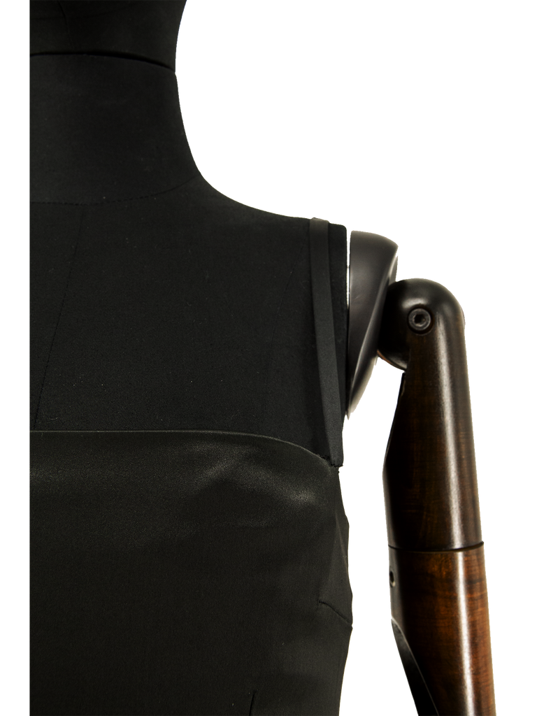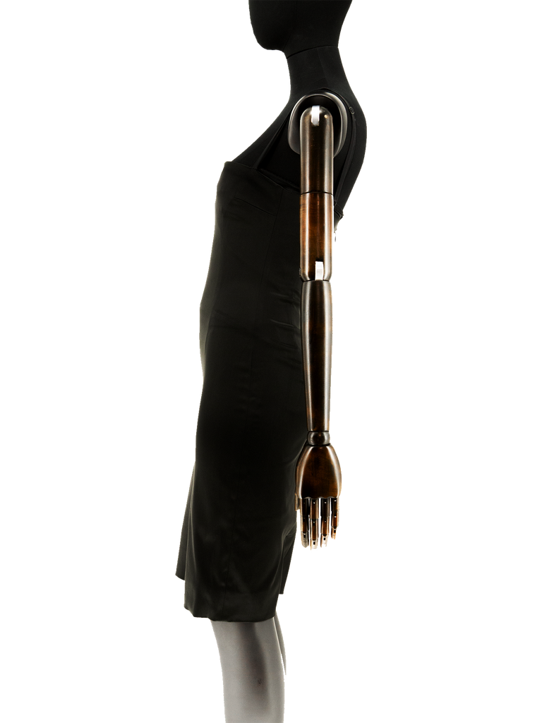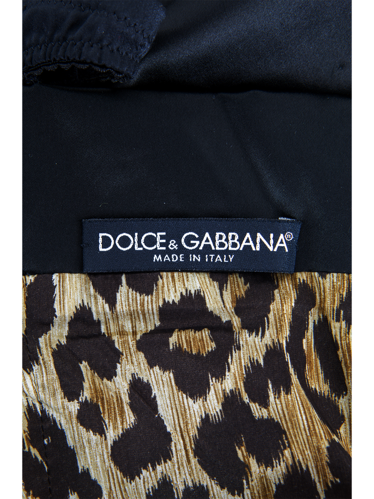 A late 1990’s Dolce & Gabbana black silk satin fitted stretch dress incorporating an inner bra, suspended on a pair of adjustable self and elasticated straps, finished with a back vent, fully lined in the iconic brown and beige leopard print lining. This item carries the Dolce & Gabbana authenticity label.