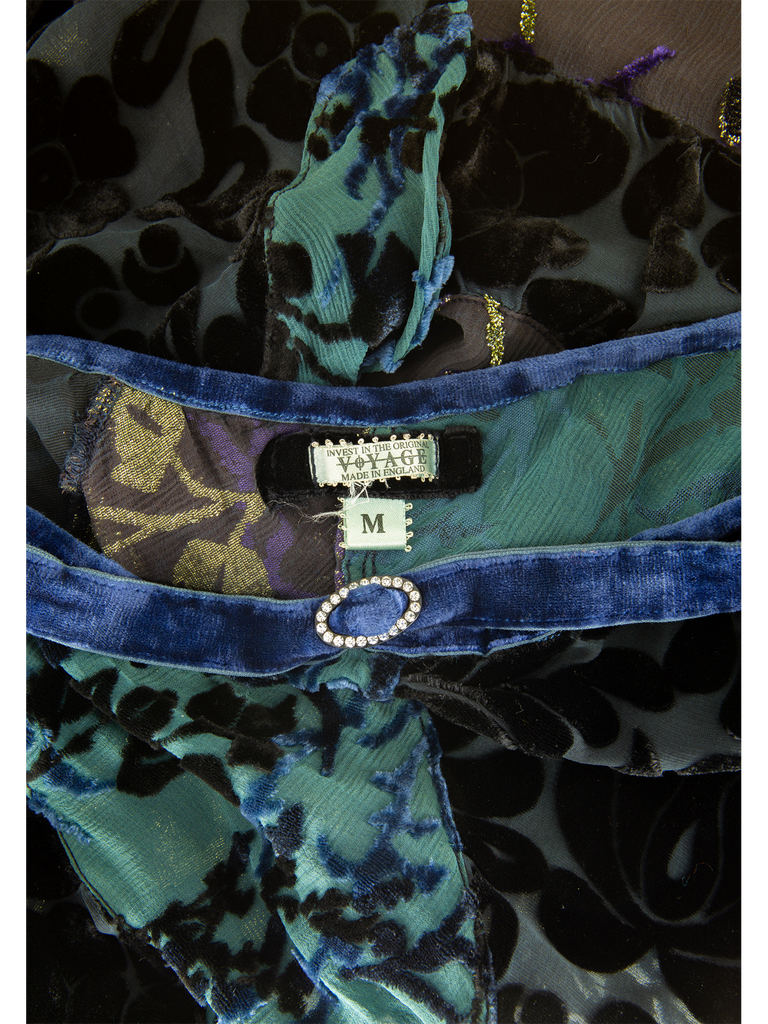 Highly sought after Voyage bias cut trousers made up of assorted contrasting panels of devoré in shades of blue turquoise and gold. The trousers hems are trimmed in beaded fringe and the waist is finished with a blue ribbon belt with delicate oval diamanté buckle.