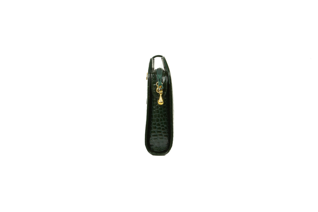 A rare early 1970s Louise Fontaine hunter-green porosus crocodile clutch/shoulder bag, comprising of one compartment with one gusseted zipper pocket, fully lined in black, suspended on an optional self strap - the reverse in forest-green leather - with polished gilt fob finials, attached to riveted rotating D-ring hinges, finished with a complementing toggle zipper closure, self flap and complementing tab bearing the House initials.