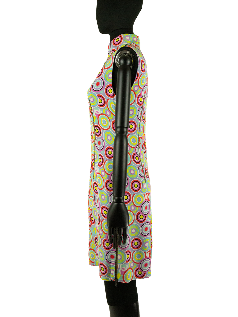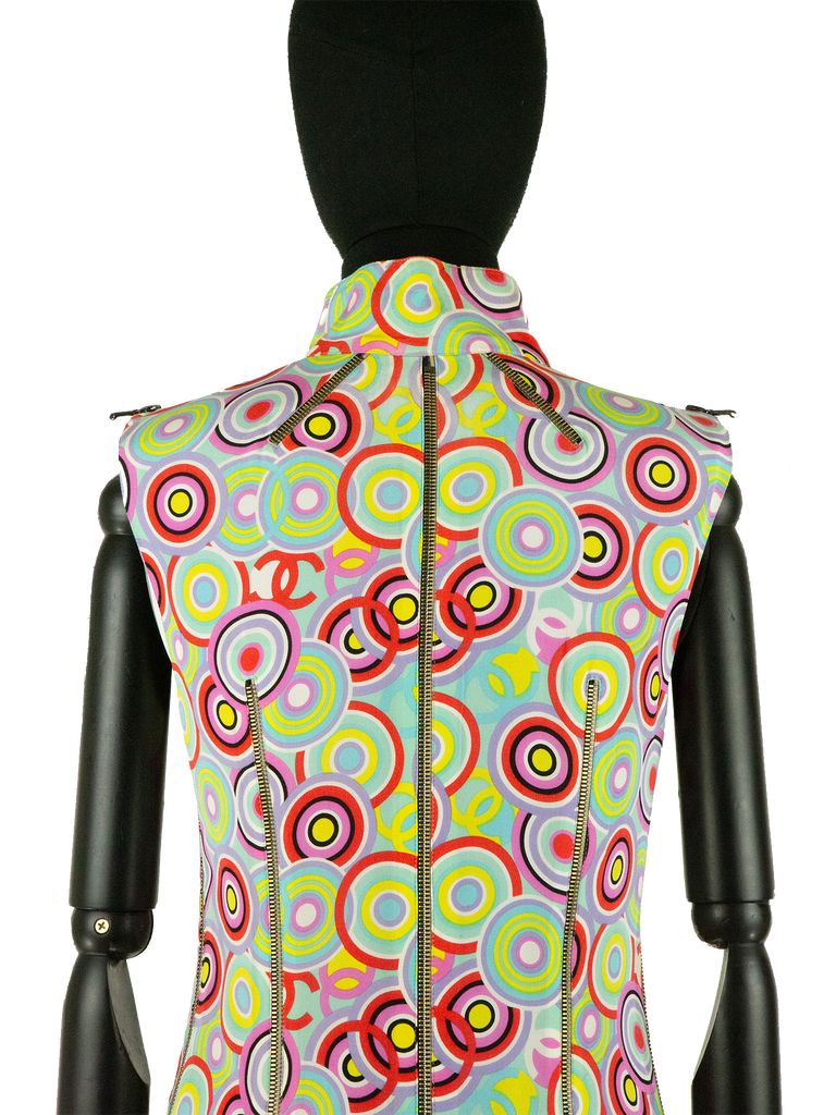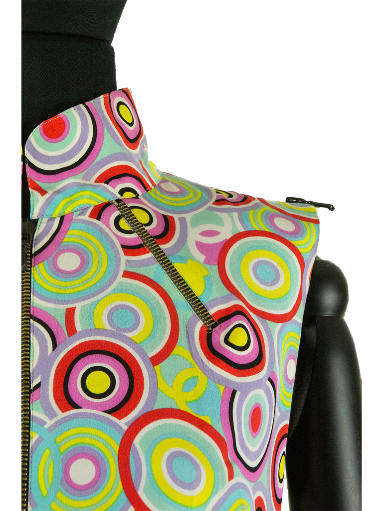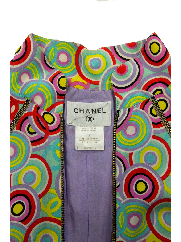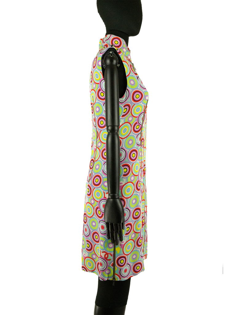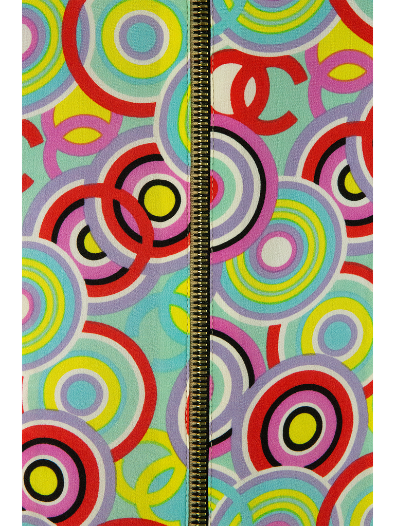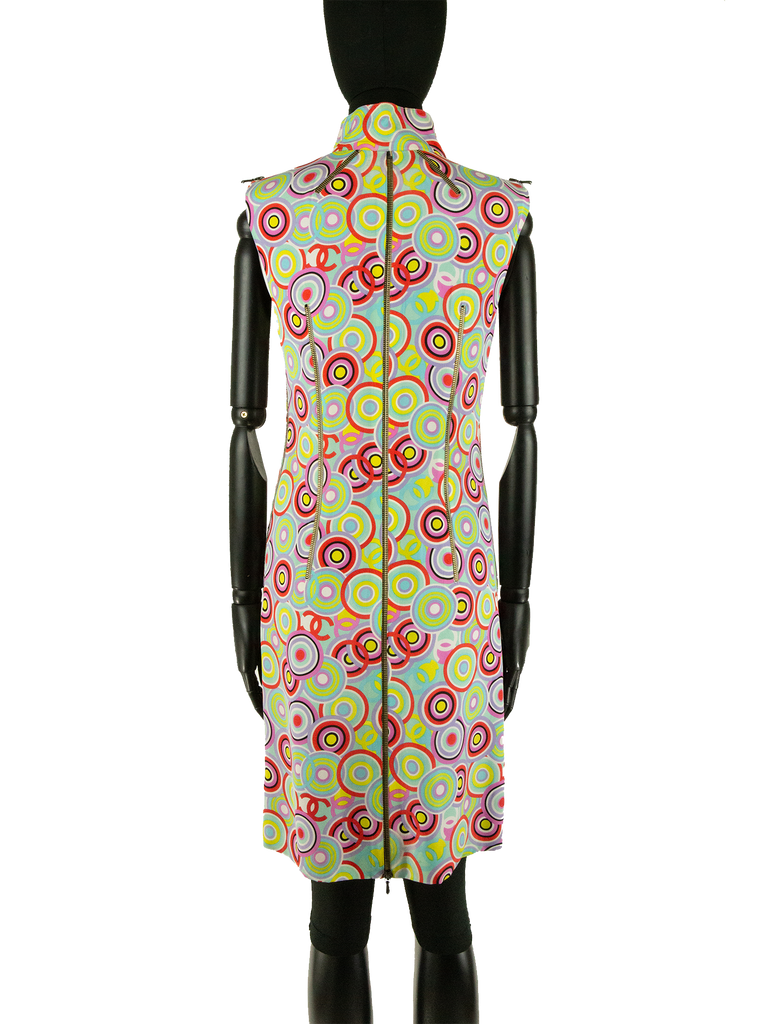 A 2001 Chanel silk shift dress, covered in a pattern of overlapping circles and the Chanel interlocking C’s in pink, lavender, aquamarine and other bright colours. The dress is sleeveless and covered in faux zips as well as having a real zip down the centre front. The neck features a mandarin collar and is fully lined in lavender silk.