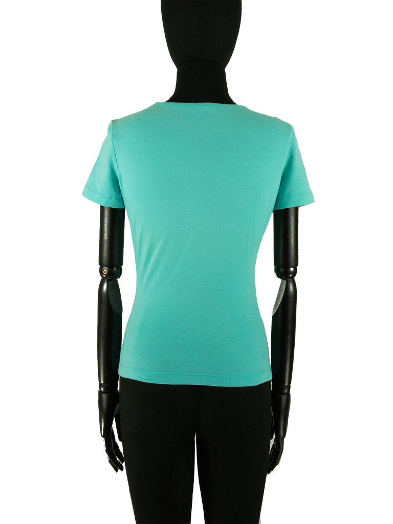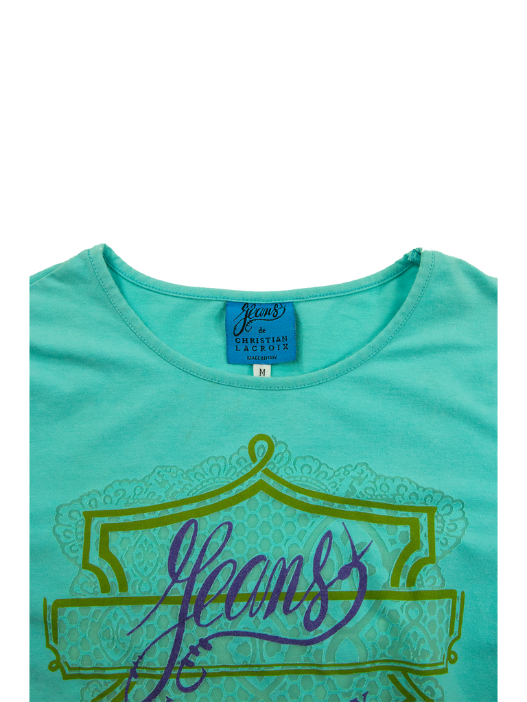 A mint coloured Jean de Christian Lacroix t-shirt with ‘Jeans Lacroix’ flocked print over a semi-sheer mesh cut out in a stylised pattern. This T-shirt is slim fit and features the ‘Jeans de Christian Lacroix’ authenticity label.
