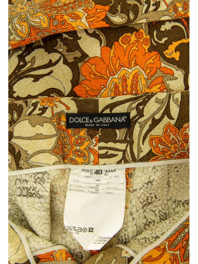 Dolce & Gabbana tailored trousers in a stylised floral 1960s style print in shades of brown and orange from the spring 2004 collection. Complimenting ivory topstitching to the front pocket flaps and fly, waistband finished with two brushed gold stylised flower buttons adorned with central faux pearls and surrounded by faux ivory stones.