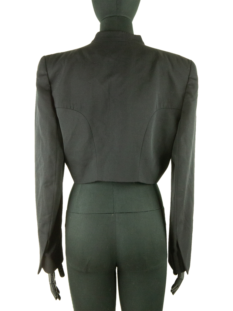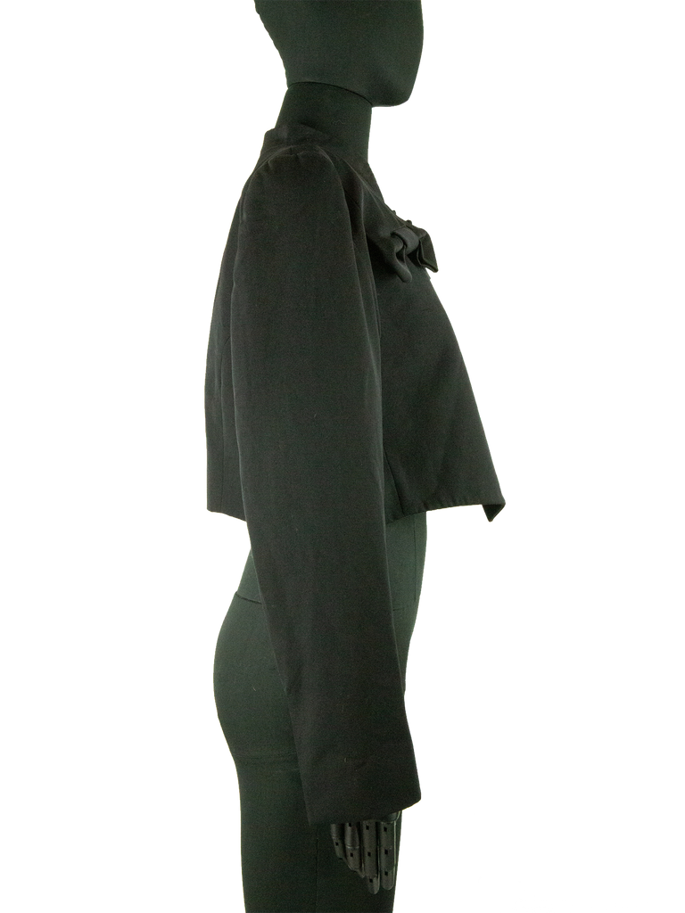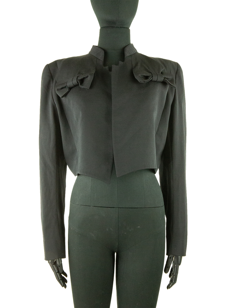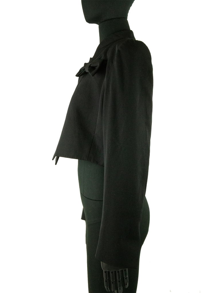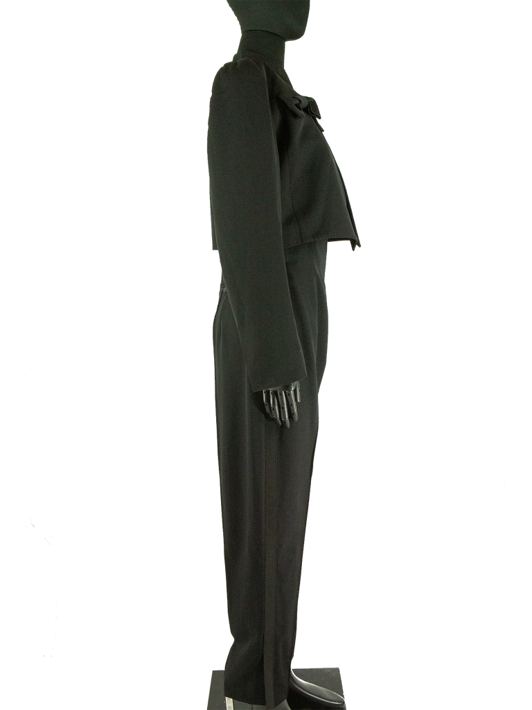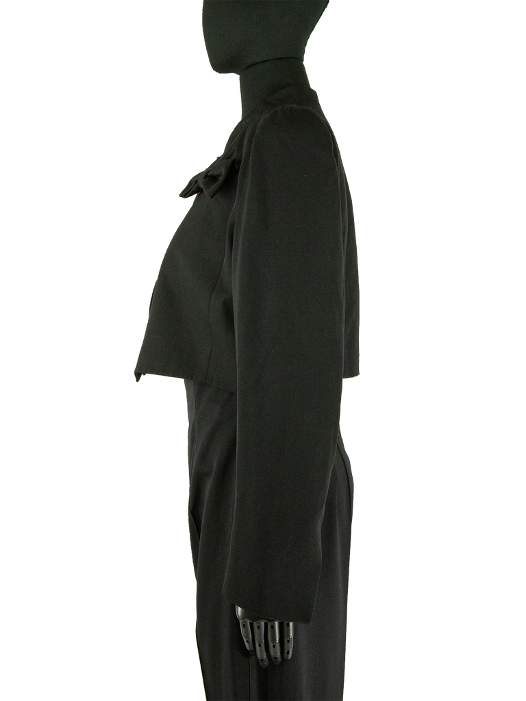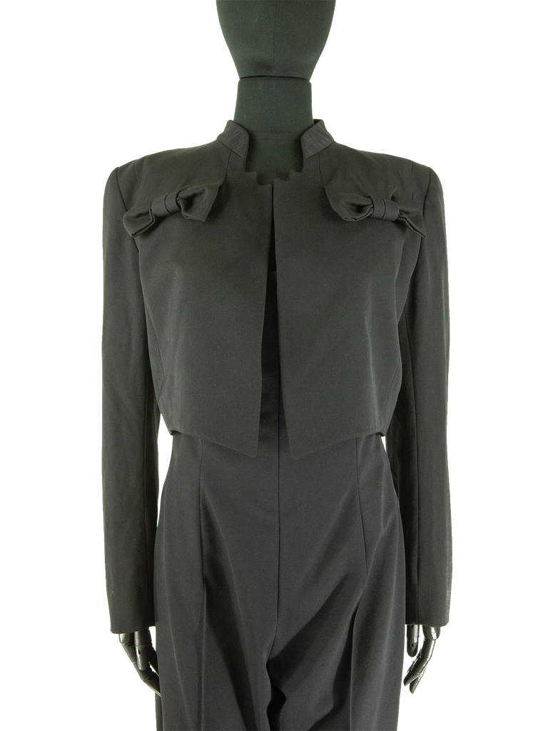 Givenchy Couture Autumn/Winter 1996 black wool bow detail cropped jacket with matching jumpsuit. Runway look #3, designed by John Galliano. The jacket features a Mandarin collar, an Open front and a "saw tooth" detail at front of the neckline. The jacket features Long sleeves, Built-in bow detail at front, Front pointed hem and Princess seams at back. Lined in Black silk satin. Featuring rounded shoulder pads creating a unique silhouette.