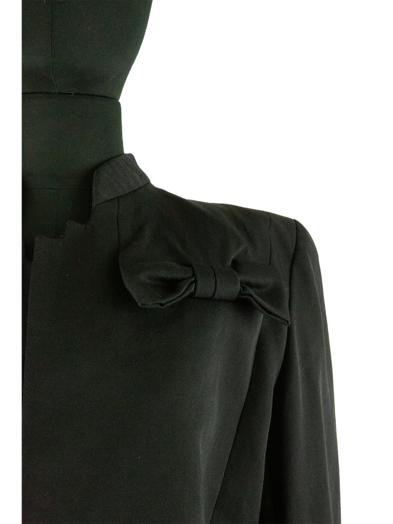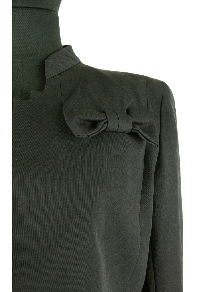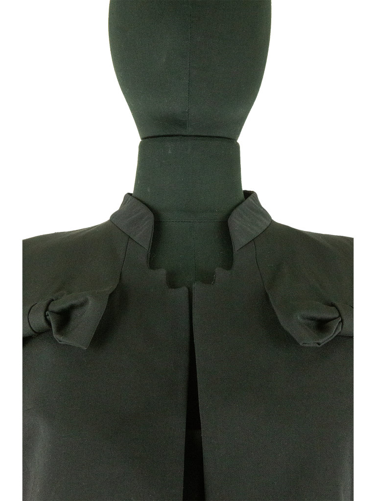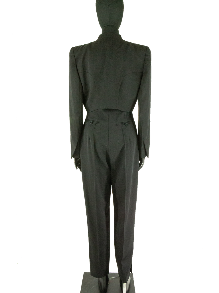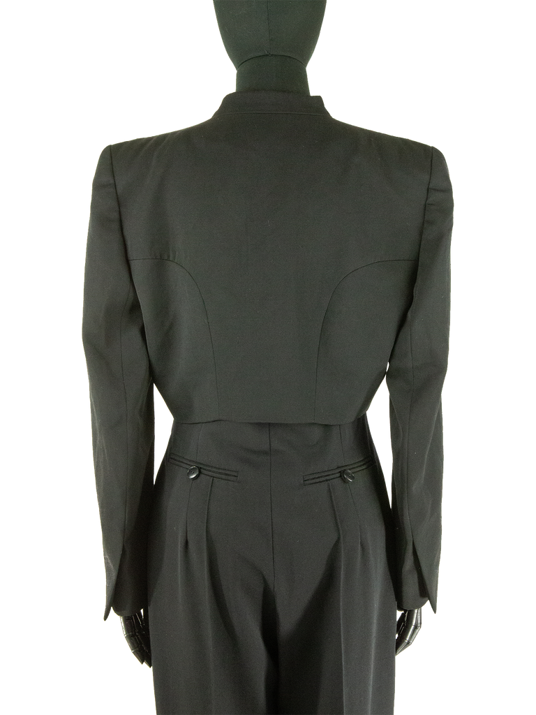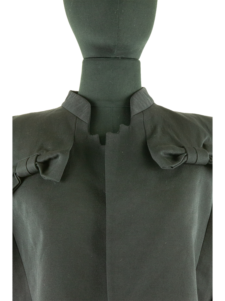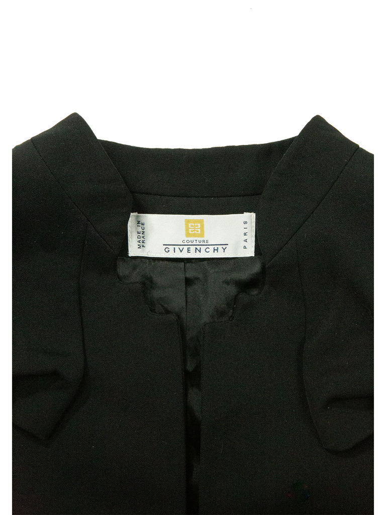 Givenchy Couture Autumn/Winter 1996 black wool bow detail cropped jacket with matching jumpsuit. Runway look #3, designed by John Galliano. The jacket features a Mandarin collar, an Open front and a "saw tooth" detail at front of the neckline. The jacket features Long sleeves, Built-in bow detail at front, Front pointed hem and Princess seams at back. Lined in Black silk satin. Featuring rounded shoulder pads creating a unique silhouette.