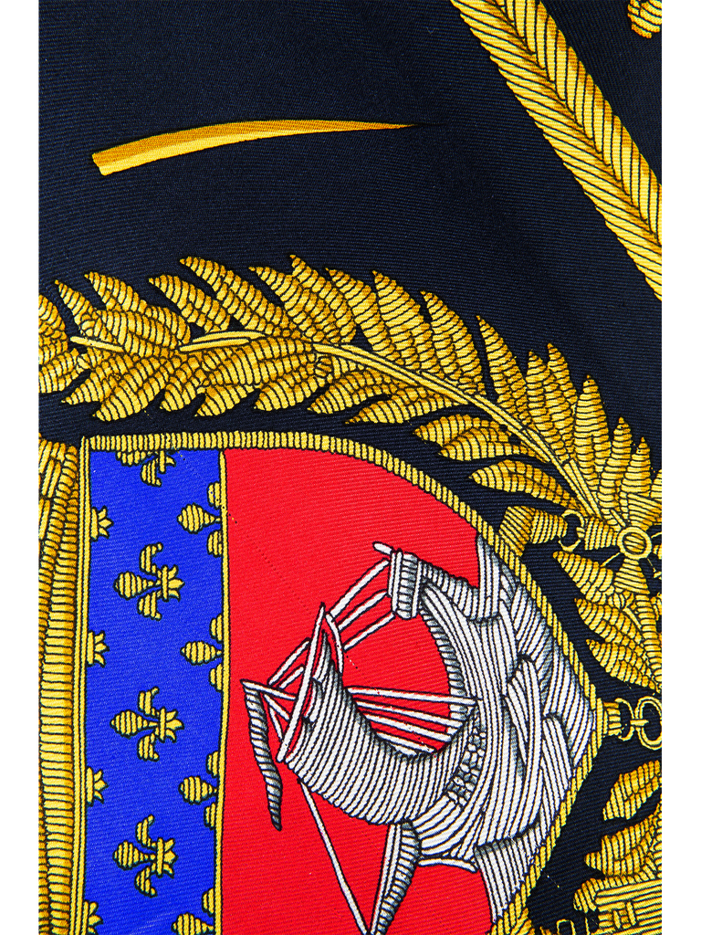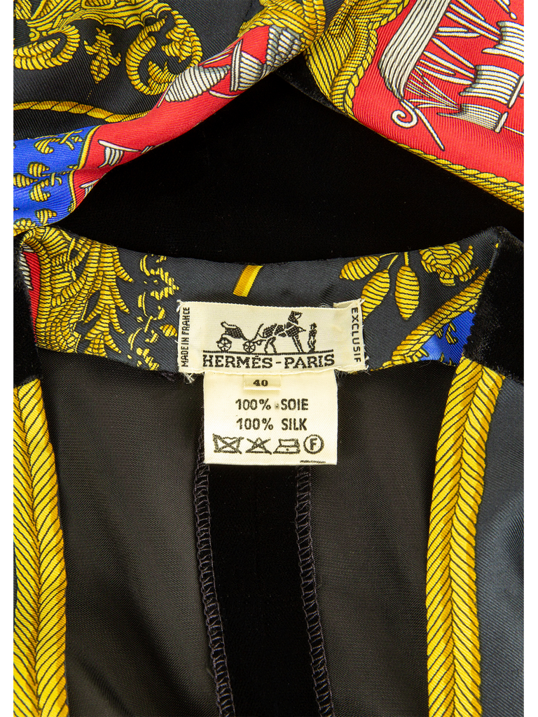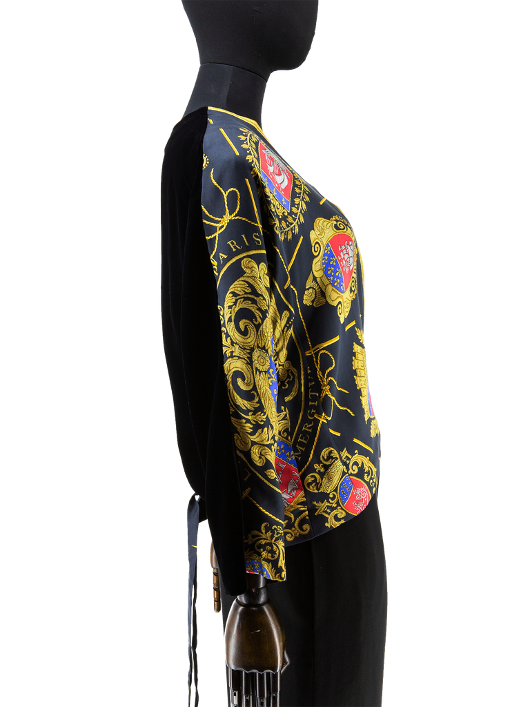 A rare and highly collectible late 1970’s Hermes unstructured wrap-over jacket with deep V-neckline and stylized kimono sleeves, the front of fine silk twill woven panels with an all-over print of Hugo Grygkar’s design (first issued in 1954) featuring both the coat of arms (“Les Armes de Paris”) and the Latin motto of the City of Paris, “Fluctuat nec mergitur” ("[the vessel] is rocked [by the waves], but does not sink"), surrounded by further coats of arms, all in shades of gold, Munsell-red, azure-blue and silver-grey, on a black background, the back of black silk velvet, finished with complementing ties. This item carries the Hermes authenticity label.