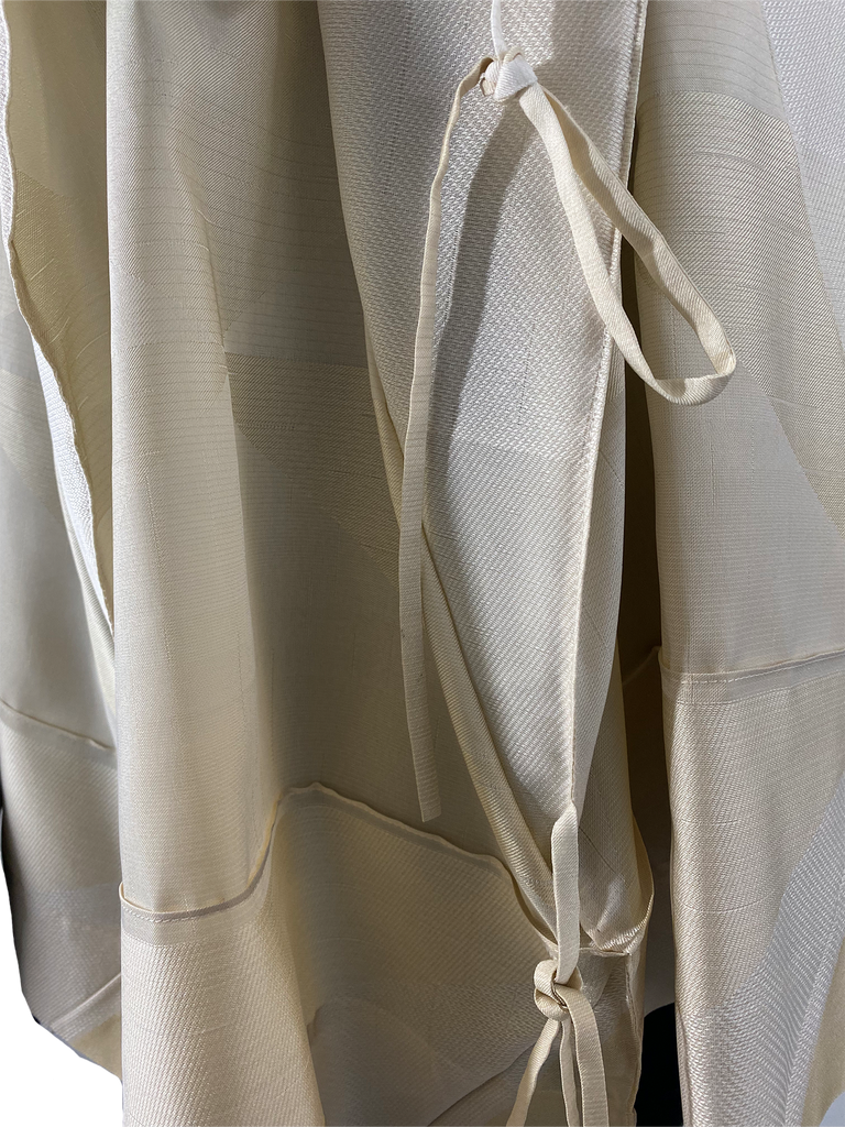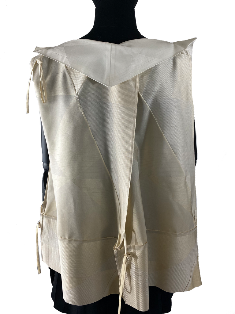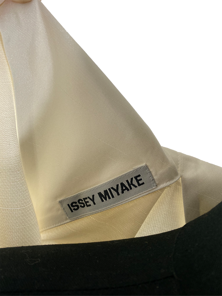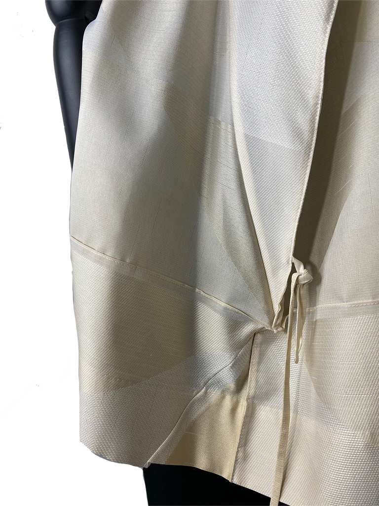 A late 1990’s Issey Miyake unstructured top of oatmeal, cream and off-white silk mixture damask, featuring an angular neckline with complementing ivory bib collar, and cut-away armholes, finished with decorative ties throughout. This item carries the Issey Miyake authenticity label