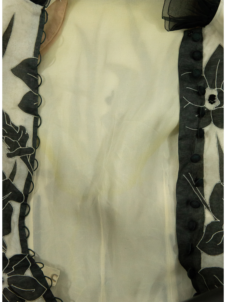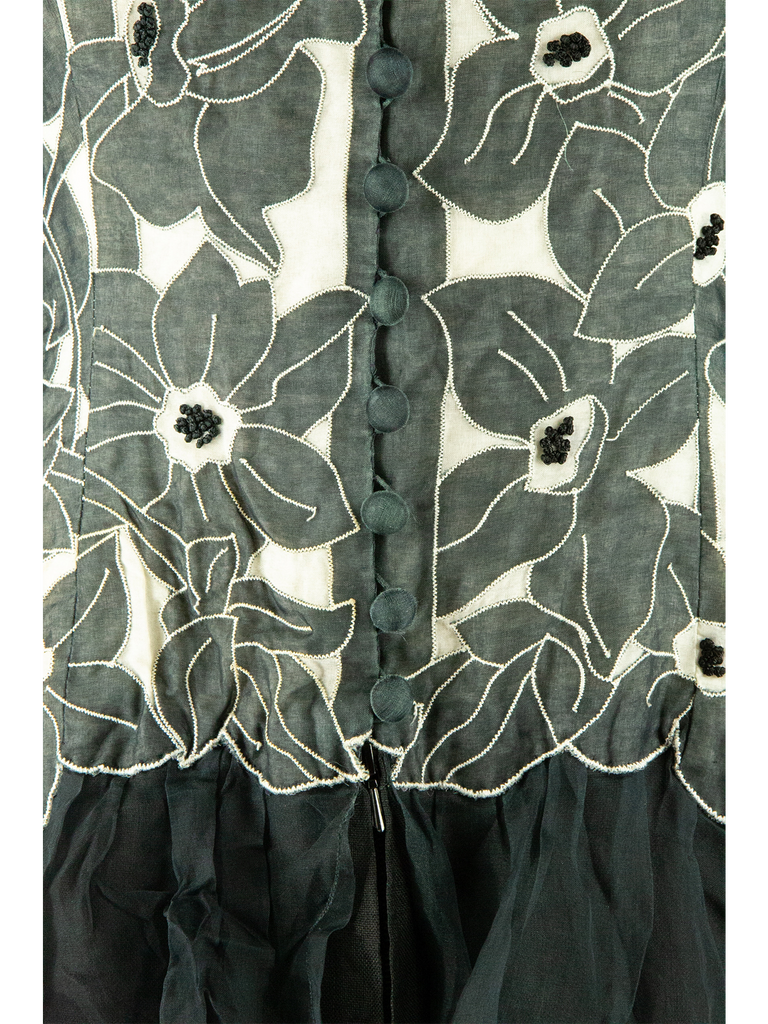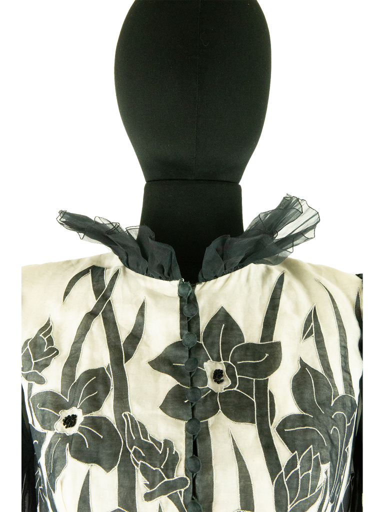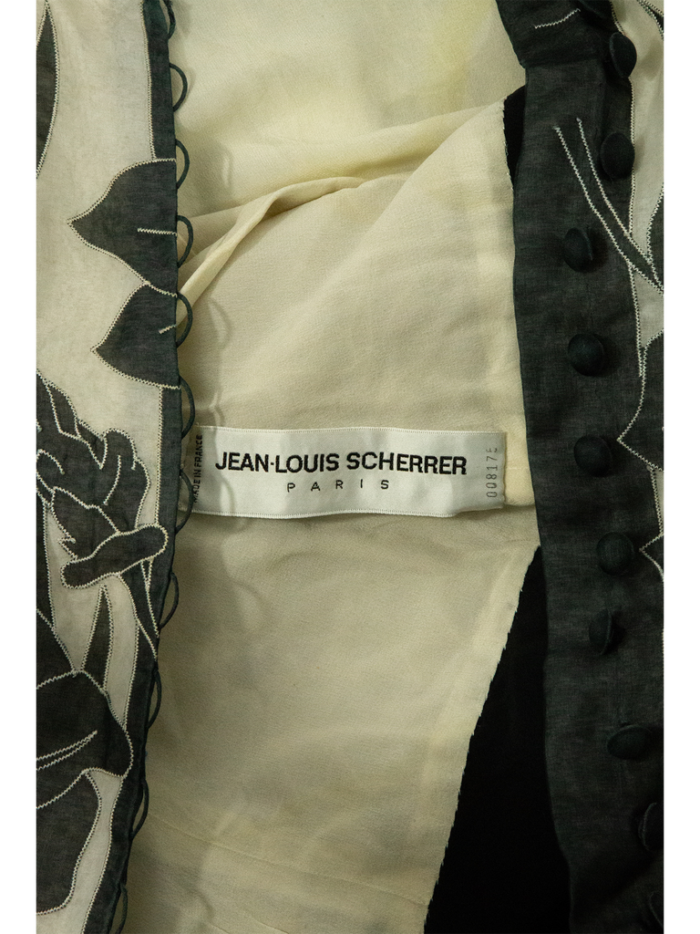 A Jean-Louis Scherrer Couture dress made mostly with black organza and pleated details. The sheer organza sleeves are half-length and puffed at the shoulder, finished with a cuff. The collar is high neck and pleated at the neckline. The main feature is the bodice which features applique embroidery of daffodils in black organza on white, with the centres of the flowers embroidered in black small glass beads. The dress also features a drop waist, where the sheer skirt is sewn under the applique in small pleats. It is also A-line and layered on top of a black opaque under-skirt. Finally, the front is fastened with a row of buttons with an additional zip at the bottom. This item carries the Jean-Louis Scherrer authenticity label.
