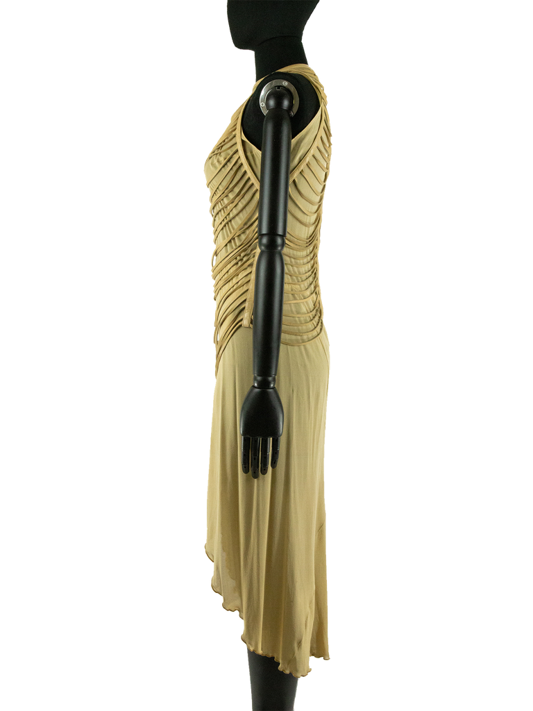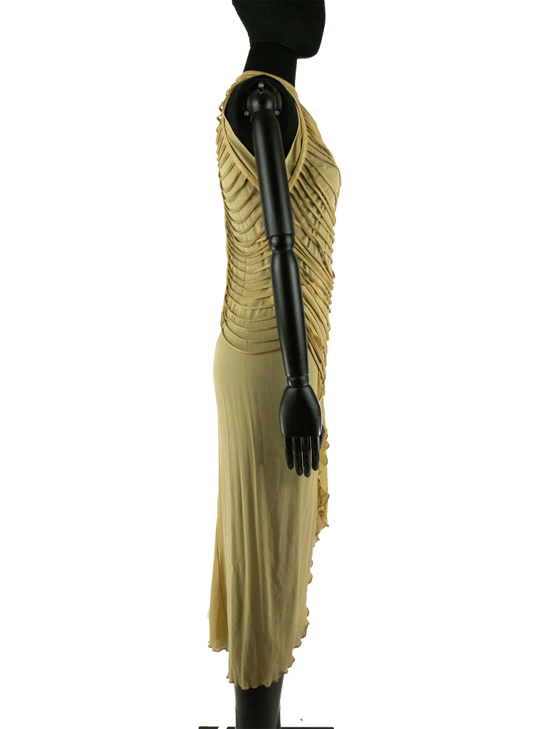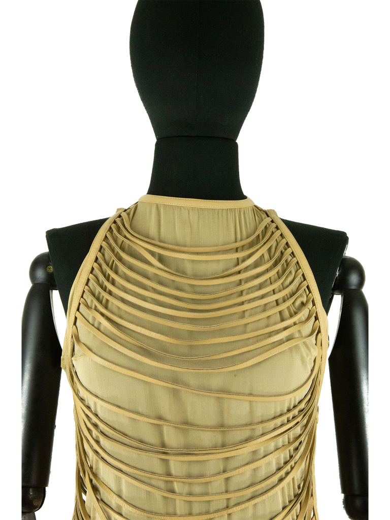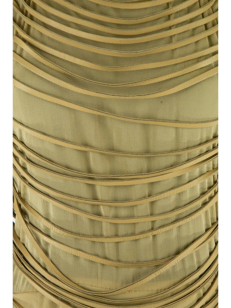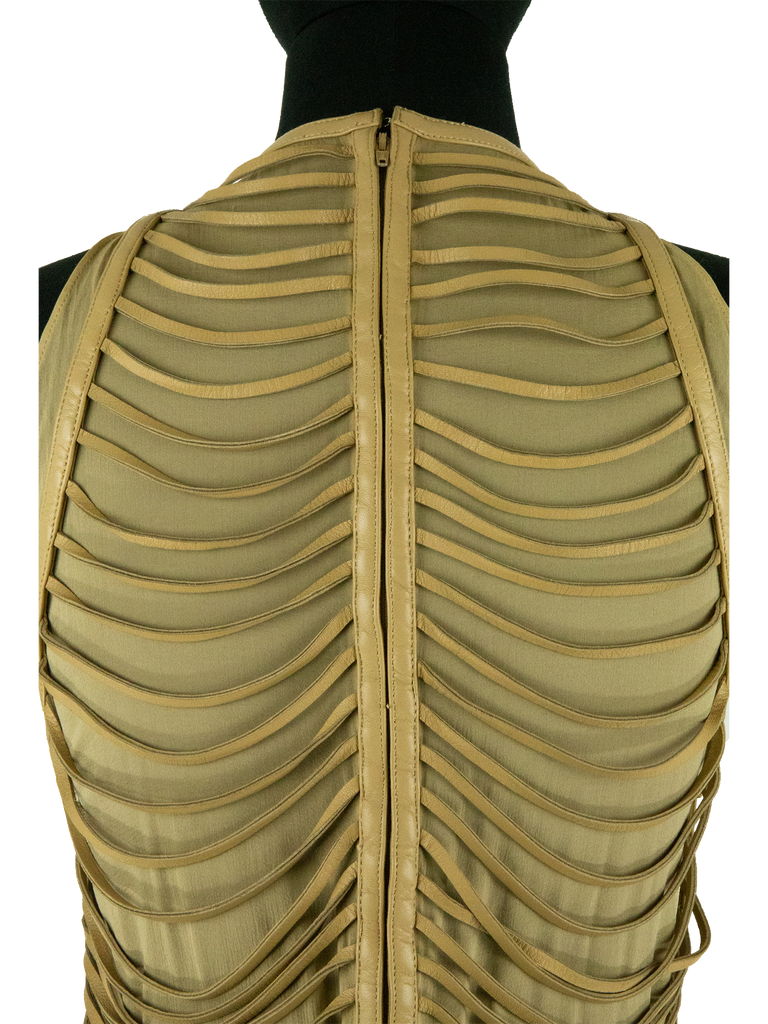 A Jean Claude Jitrois chiffon taupe maxi dress with a layer of beige leather fringing draped perpendicular across the bodice. The dress is sleeveless and features a curved wrap in the front. The dress is fastened down the centre back with a zip.