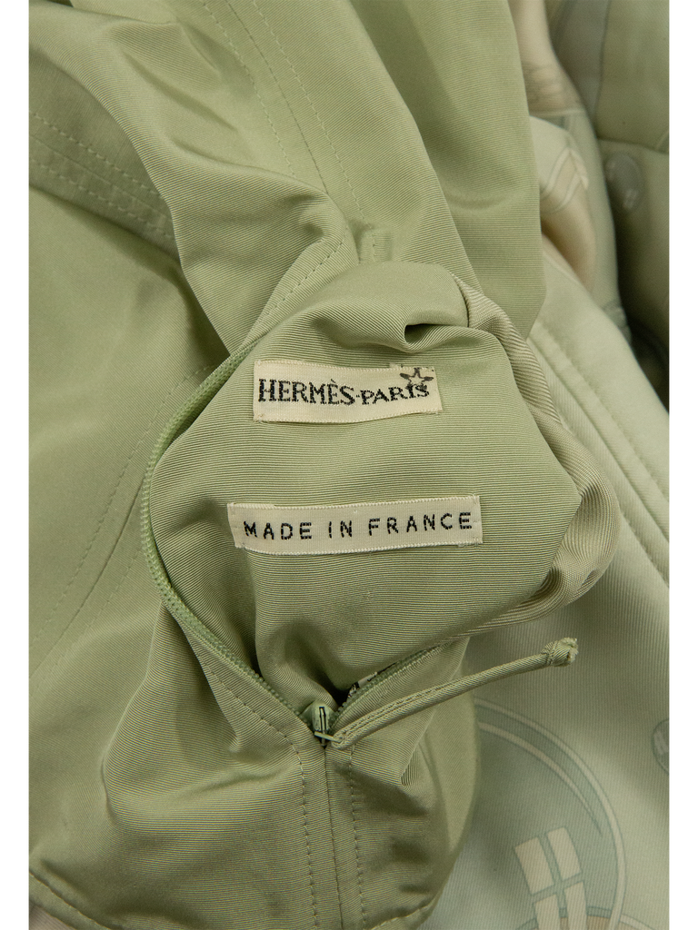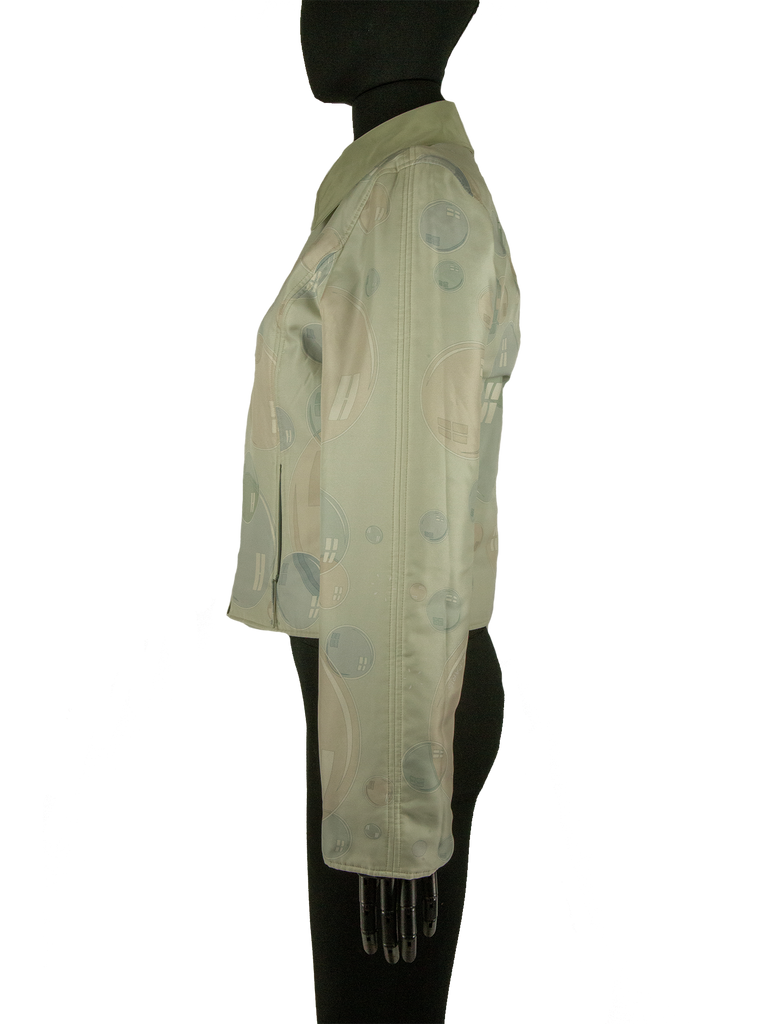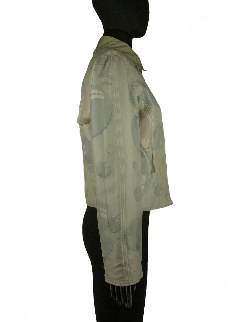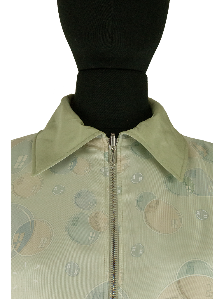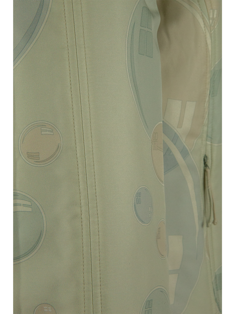 A 1990s Hermès reversible jacket with a bubble print of green, blue and pink on a silvery grey background on one side and light beige colour on the other. This jacket features a classic collar, two side welt pockets at the bottom on both sides; with the zip adorned with string toggles. Double stitch seams run throughout the jacket; shaping it to the body in the same way a dart would do. A Hermès branded silver zip run up the front. The toggle of the zip can be flipped both ways to ensure the reversible functionality can be met.
