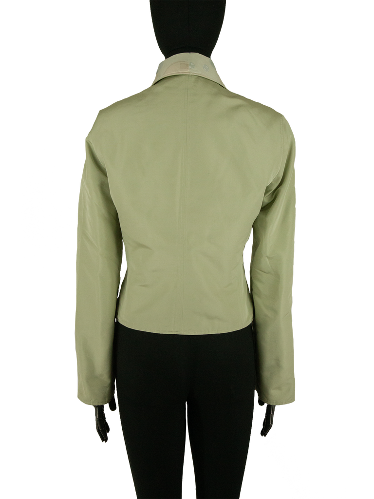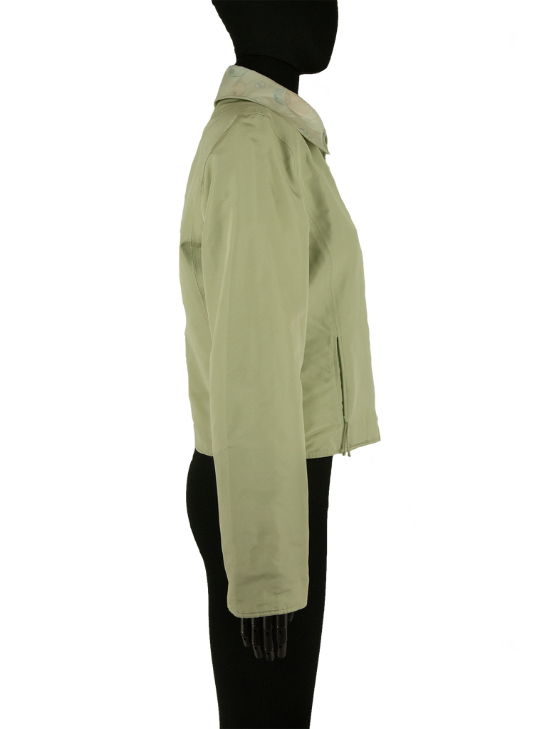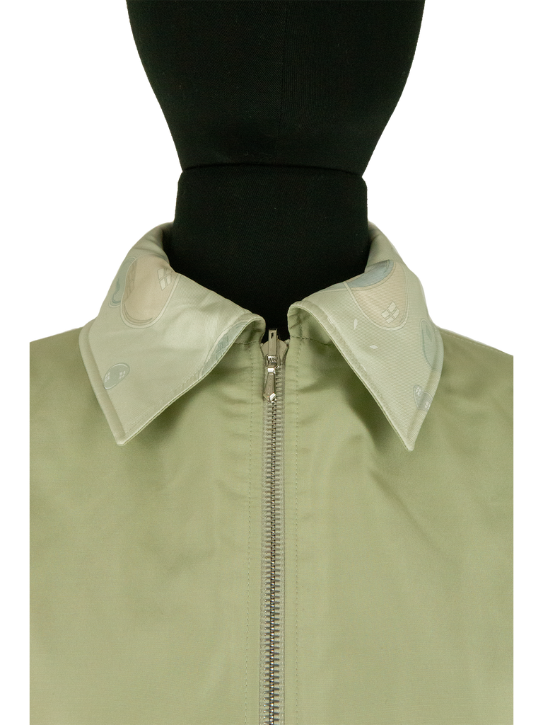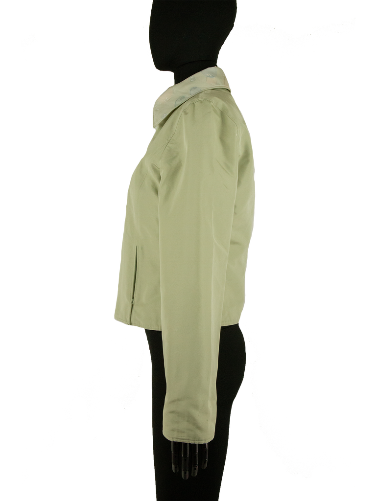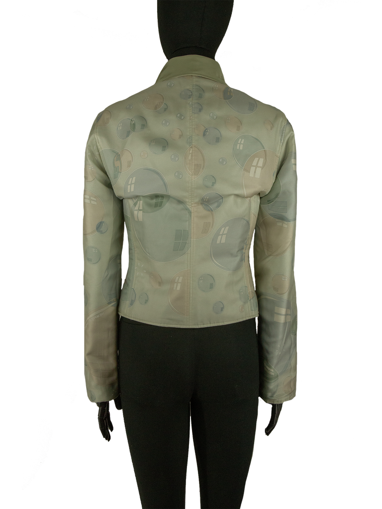 A 1990s Hermès reversible jacket with a bubble print of green, blue and pink on a silvery grey background on one side and light beige colour on the other. This jacket features a classic collar, two side welt pockets at the bottom on both sides; with the zip adorned with string toggles. Double stitch seams run throughout the jacket; shaping it to the body in the same way a dart would do. A Hermès branded silver zip run up the front. The toggle of the zip can be flipped both ways to ensure the reversible functionality can be met.