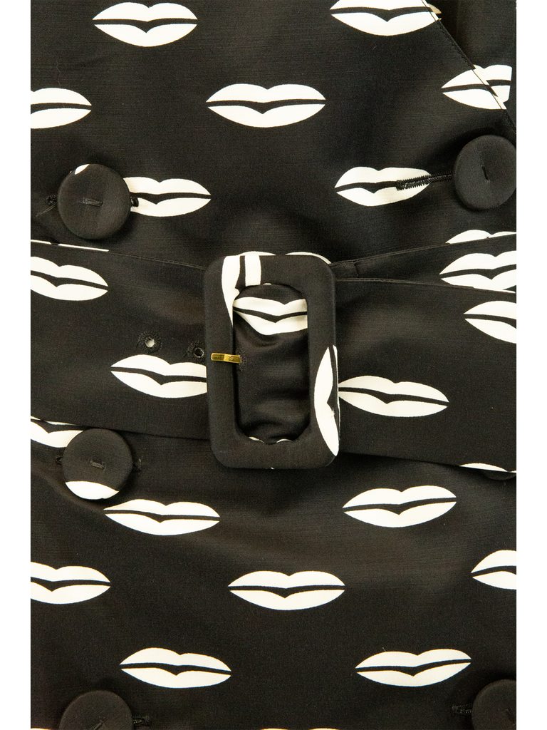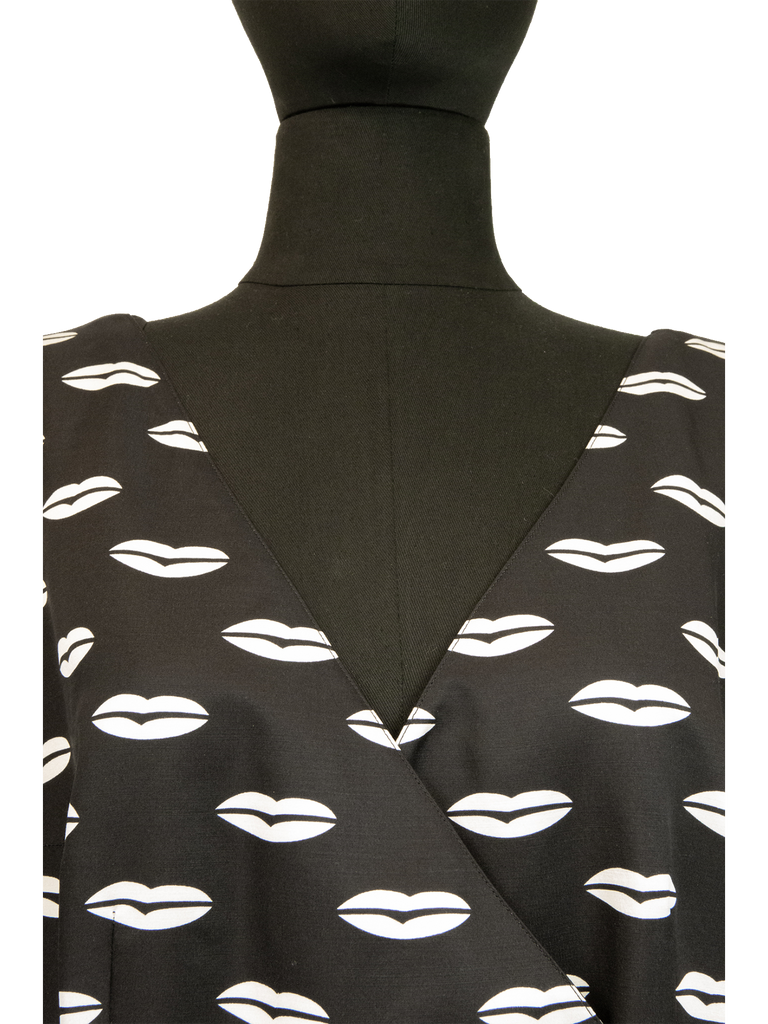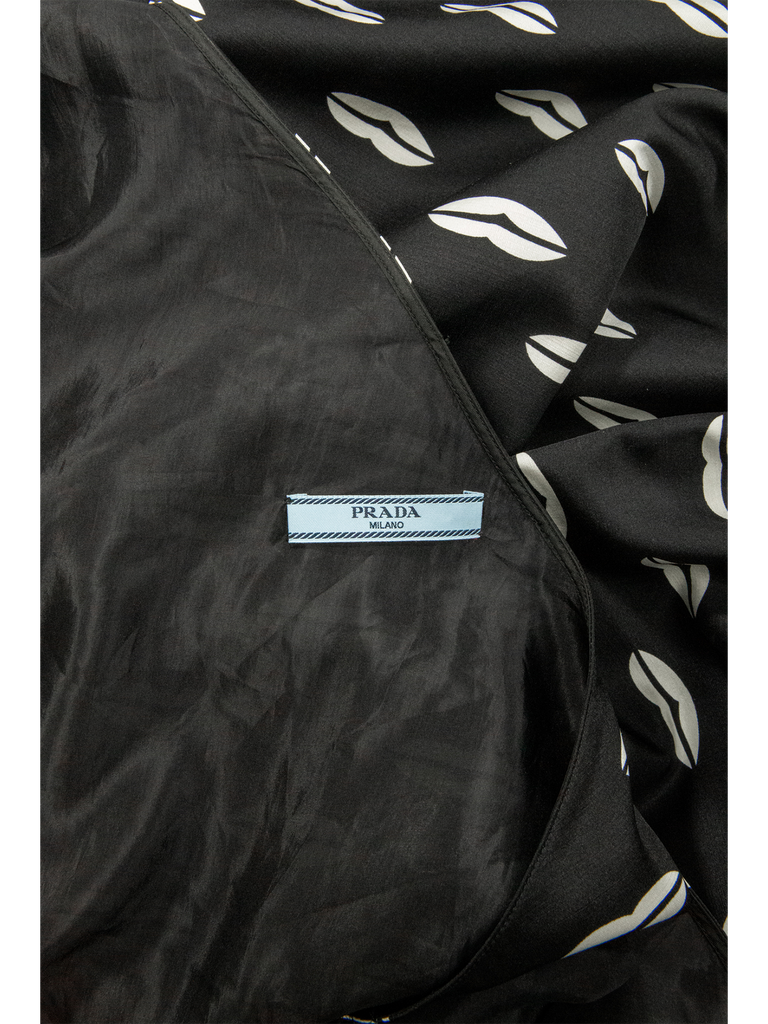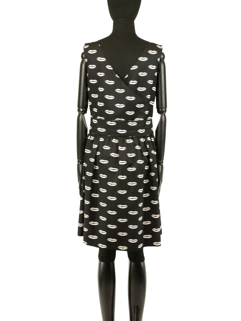 A Prada silk dress with a wrapped over double-breasted fastening. The dress is enveloped in a repeating abstract print of black and white lips. The bodice has a deep v neckline and is darted and sleeveless, the skirt is softly pleated into the bodice for a fuller effect. it is fully lined and comes with a matching belt. This item carries the Prada authenticity label.