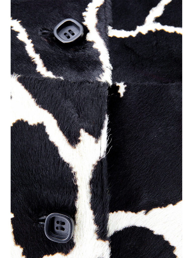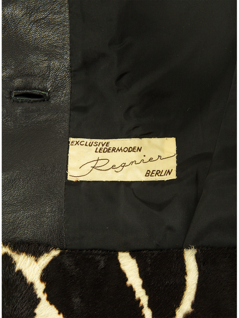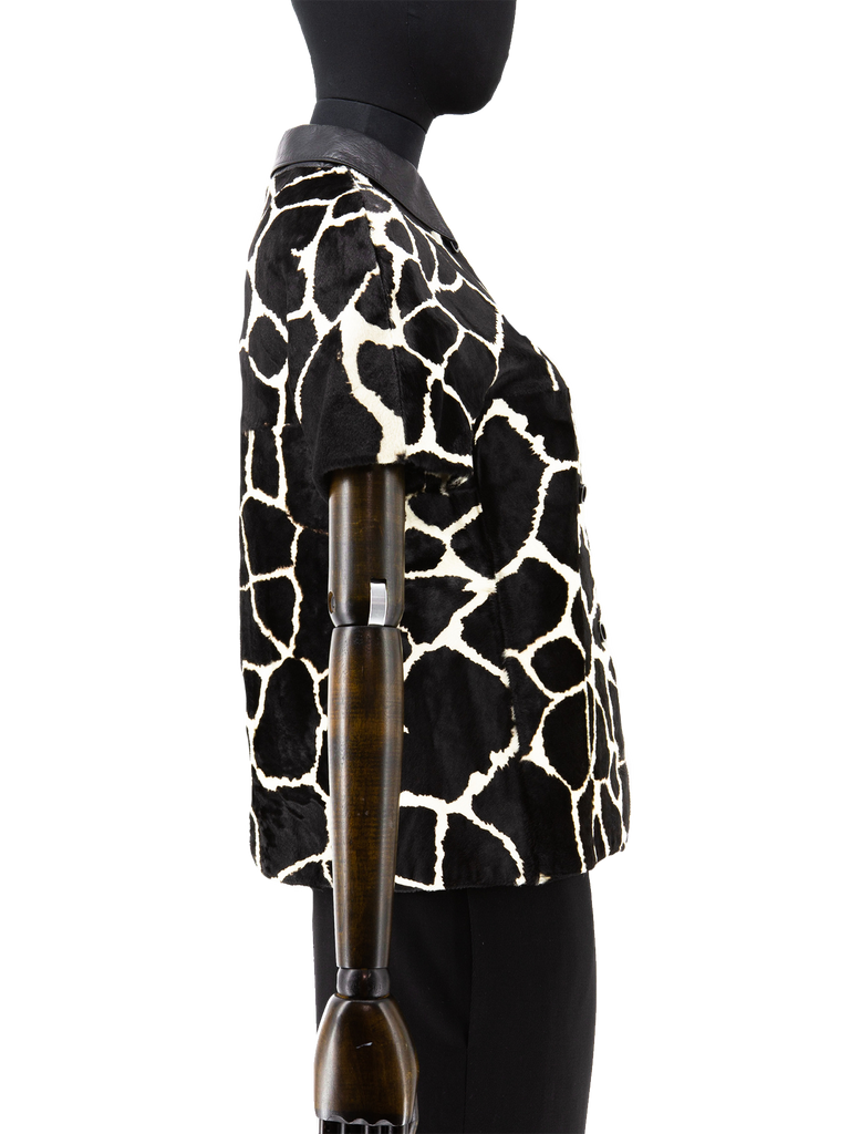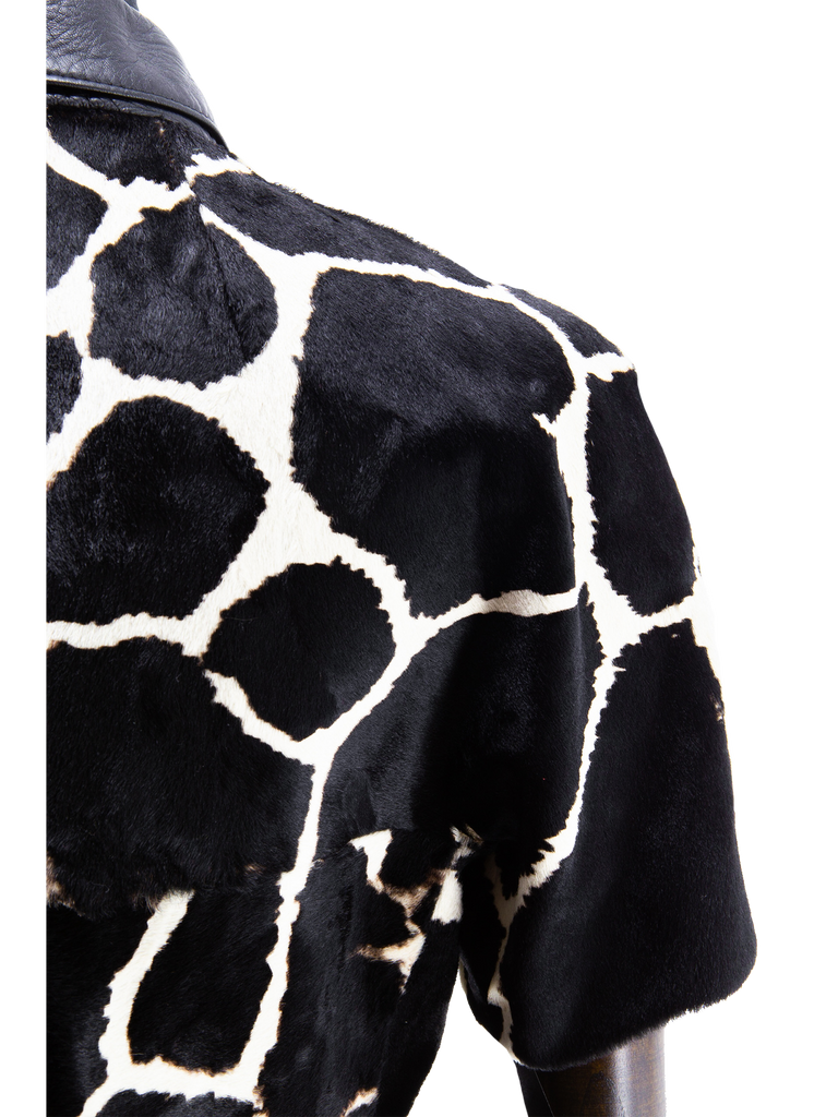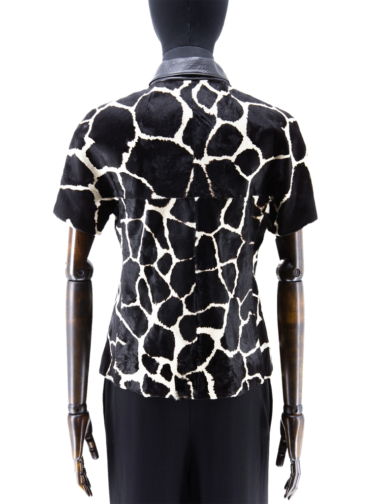 A late 1960’s Exclusive Ledermoden Regnier black and cream calfskin giraffe print shirt-jacket, featuring a black grained leather collar, deep front and back yoke with grown-on short sleeves, finished with a set of black stylised square concave buttons, fully lined in a black satinised lining. This item carries the Exclusive Ledermoden Regnier authenticity label.