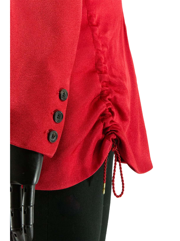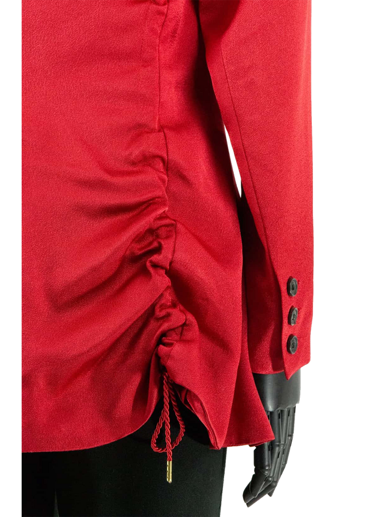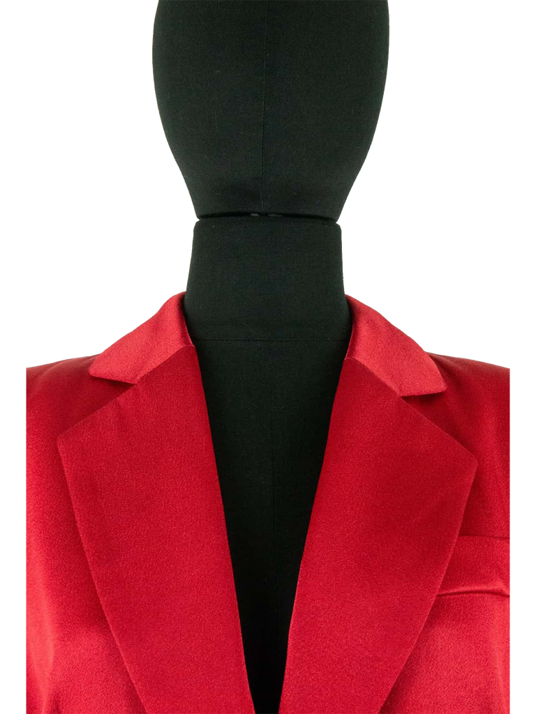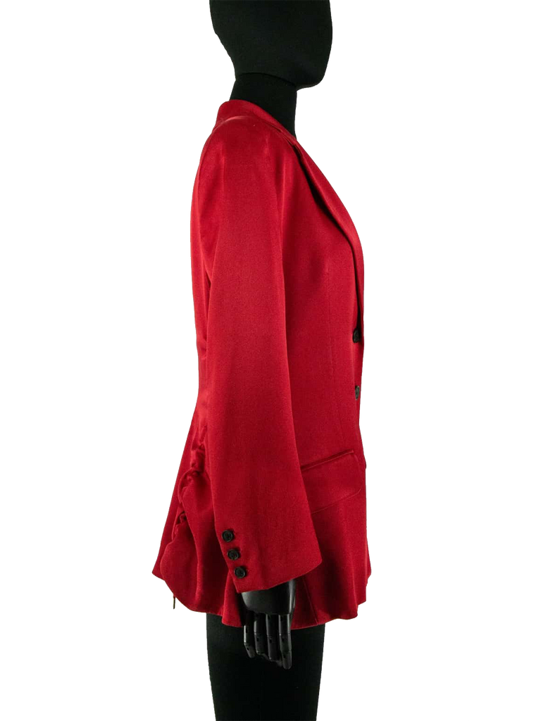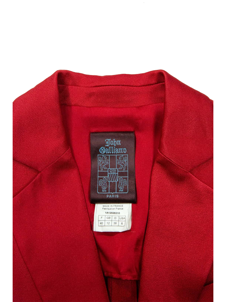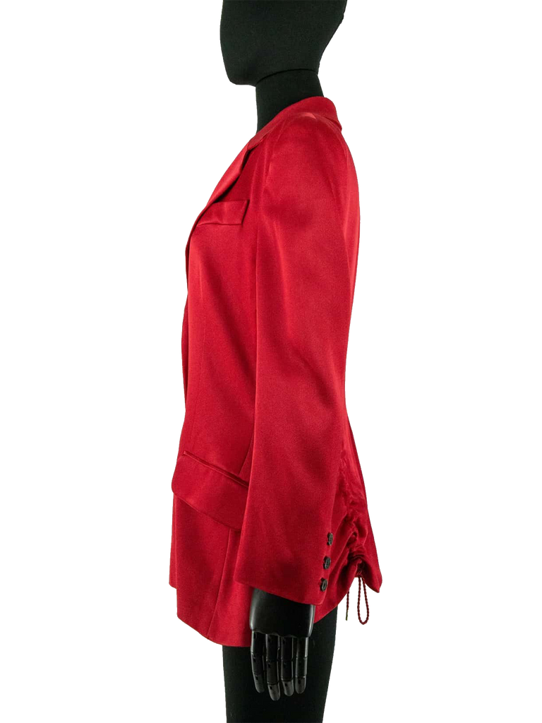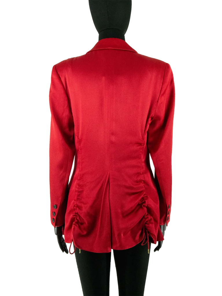 A red satin John Galliano A/W 2001 single-breasted blazer with black buttons embossed with the ‘John Galliano’ house logo up the front and on the cuff. At the front of the blazer are two covered pockets and one at the breast under the lapel. The cut of the blazer is done to emphasise the waist as it dramatically comes in. At the back are two draw straw toggles to bring the back panels up into a gathered effect - both are fully adjustable to the wearers desired look.