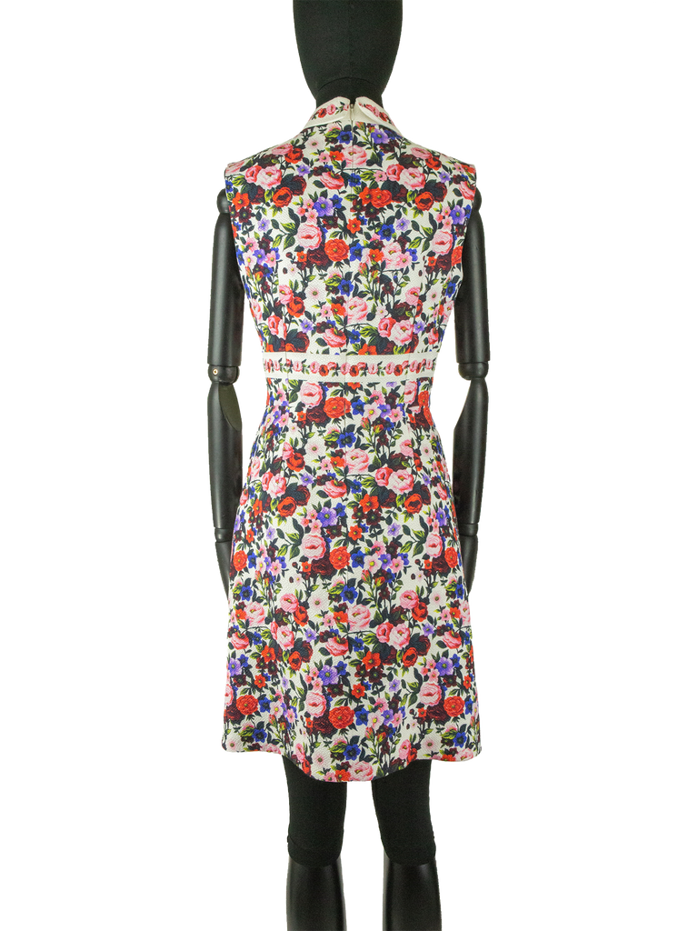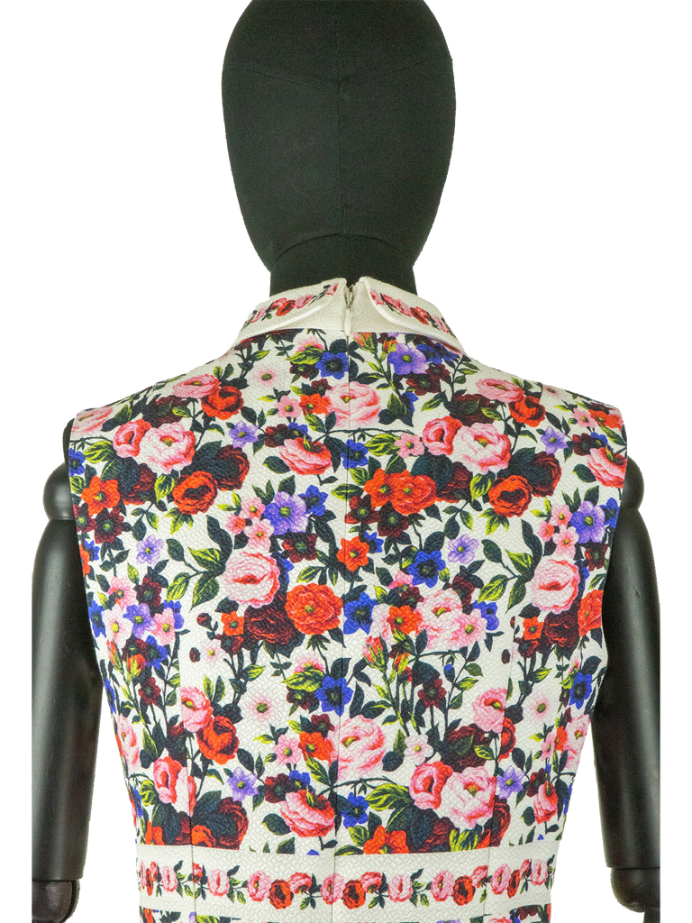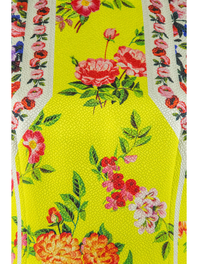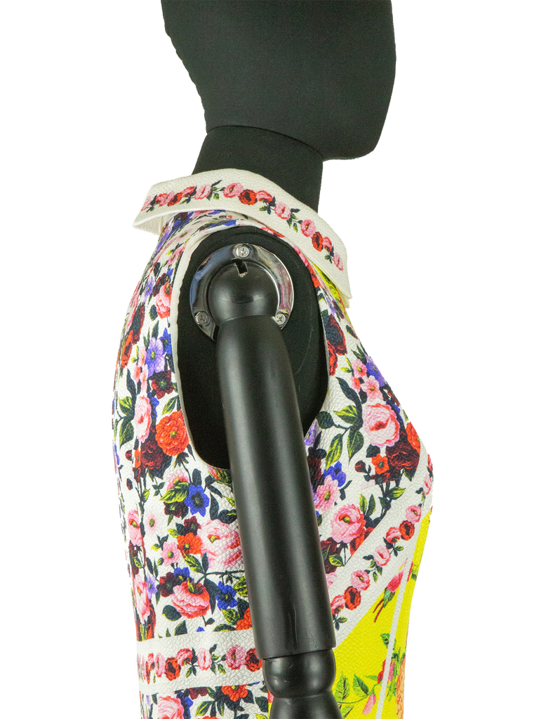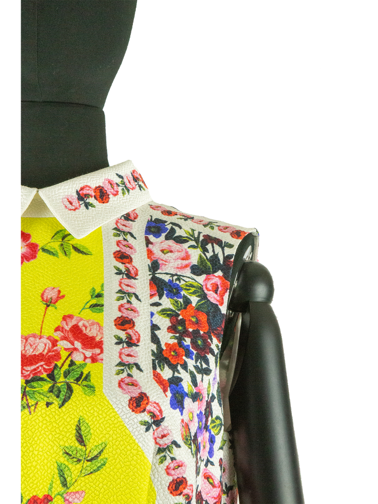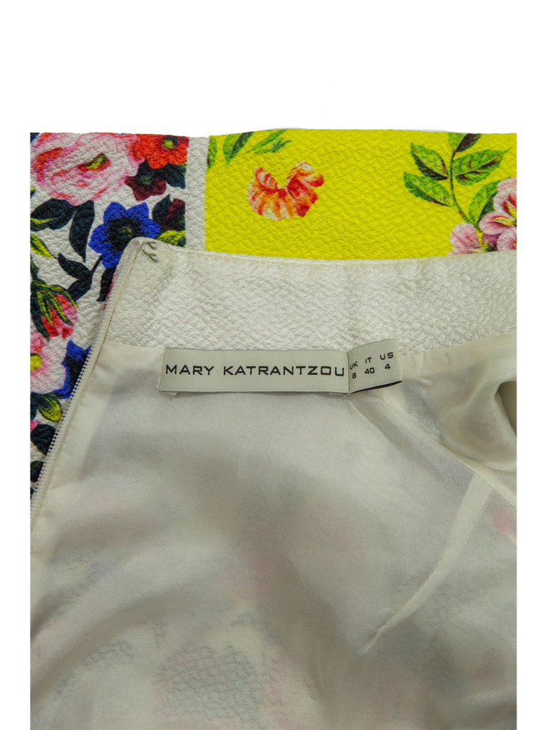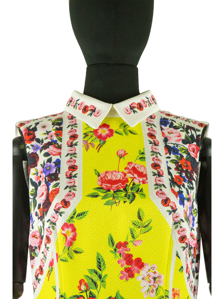 A Mary Katrantzou skater dress adorned in the brand's iconic prints, of symmetrical floral print with roses and peonies in shades of pink and red on a lemon yellow. The darted bodice is sleeveless with a standard collar, attached to an A-line skirt. Finally, the dress is lined and fastened with a zip down the centre back