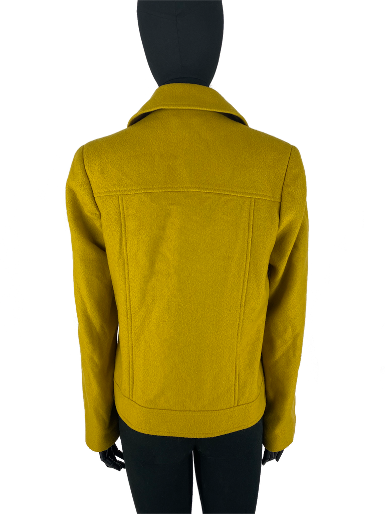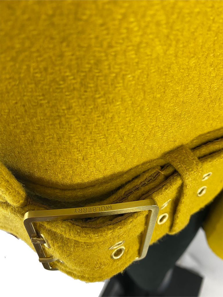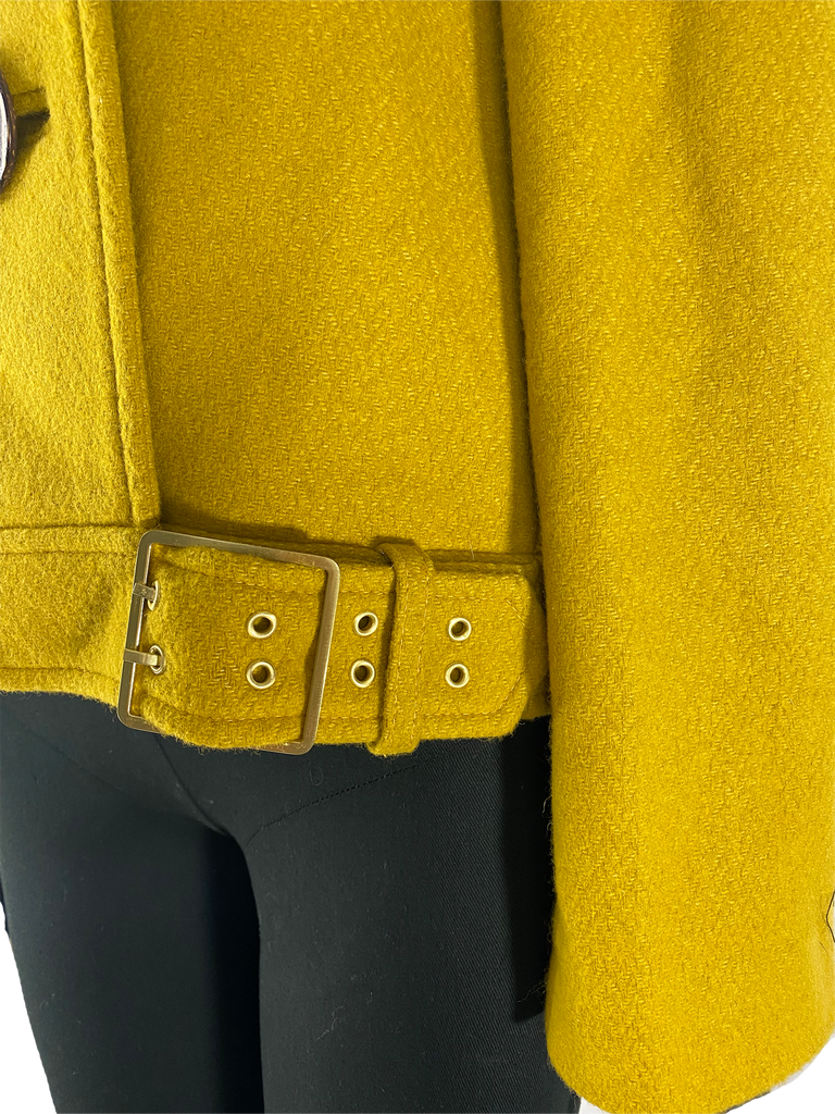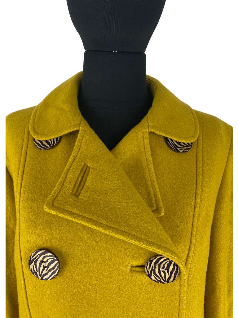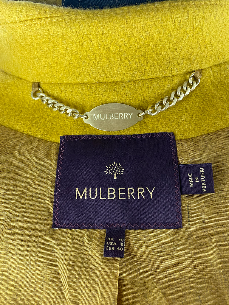 A contemporary Mulberry woollen jacket in mustard yellow. This jacket has been inspired by bikers’ jackets, mimicking the belt and buckle at the hem and the single notch collar paired with the double-breasted bodice. The jacket is fastened with large statement buttons, made of wood and patterned in zebra print. This jacket is fully lined in a golden yellow.