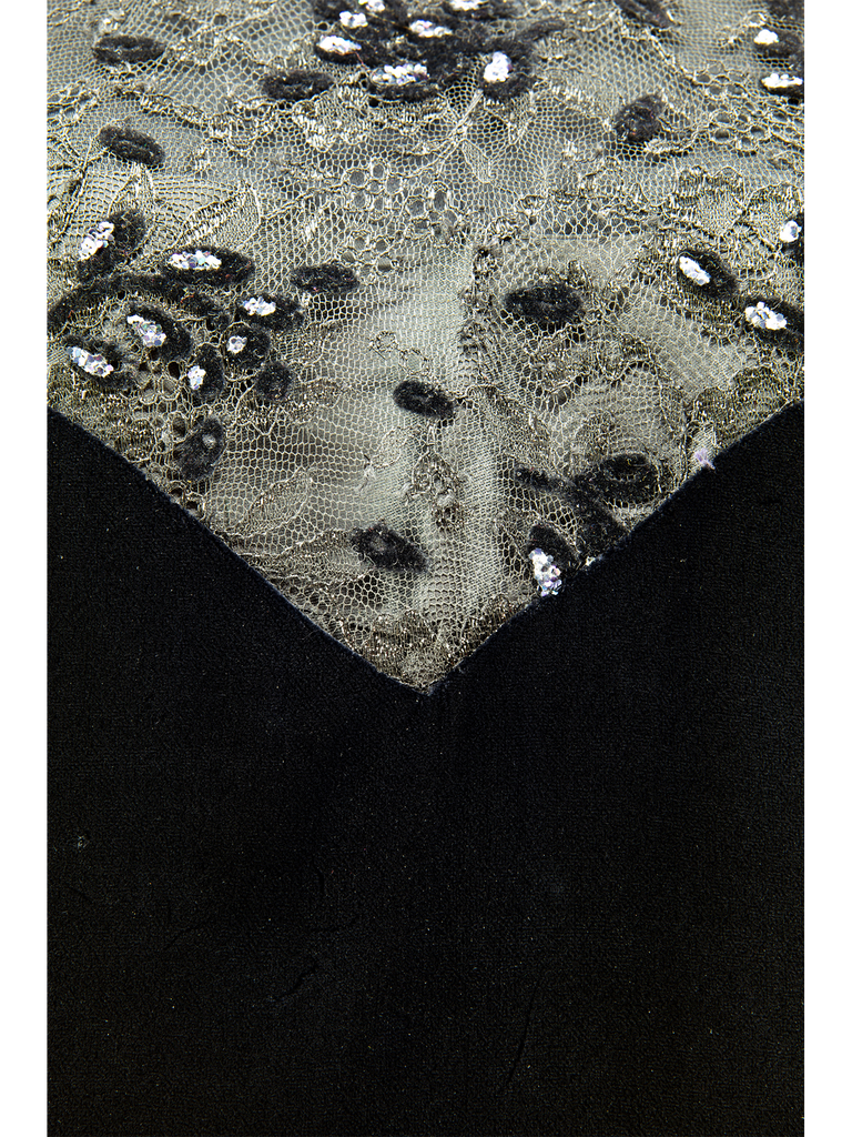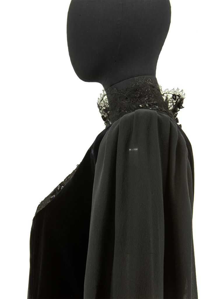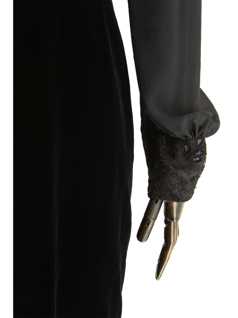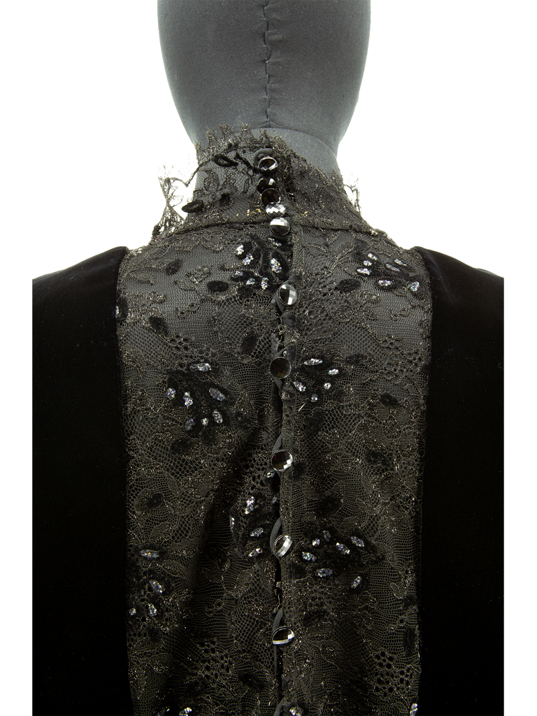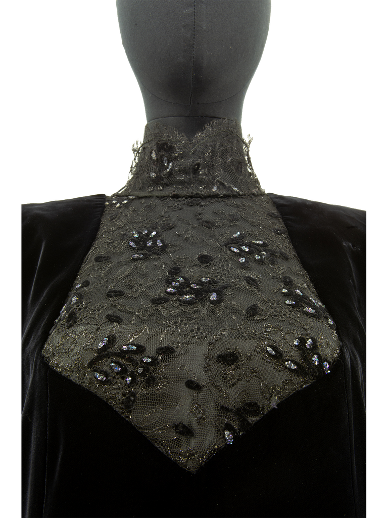 A mid 1980’s Ungaro Parallele all-in-one dress of black silk velvet with style seams, front pentagonal and back scoop insertion of black Chantilly lace with velvet and lurex detail, in a floral and foliage design, with miniature hexagonal iridescent sequin highlights, the complementing scalloped stand collar in self, the fine georgette set-in bishop sleeves with deep folds at head and soft gathers at cuff with zipper opening, finished with a set of faceted black French jet buttons and loops, fully lined in a satinised lining. This item carries the Ungaro Parallele authenticity label.