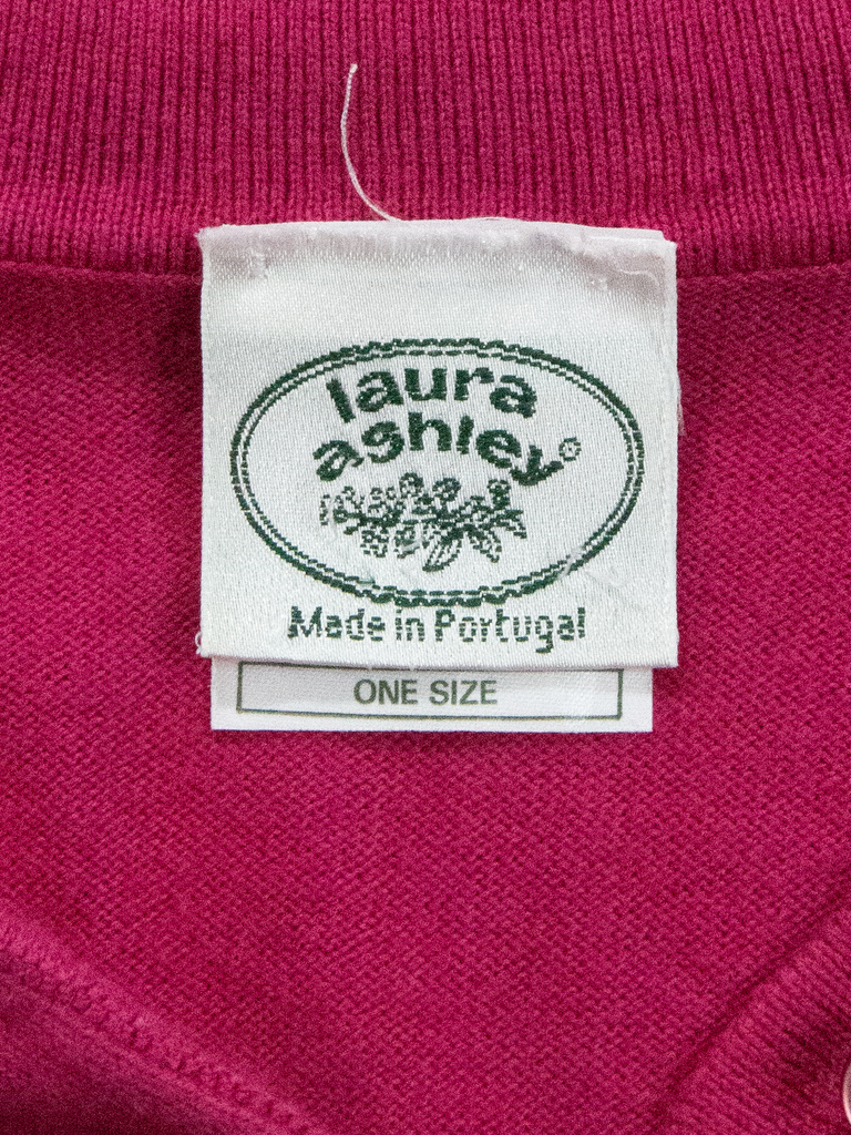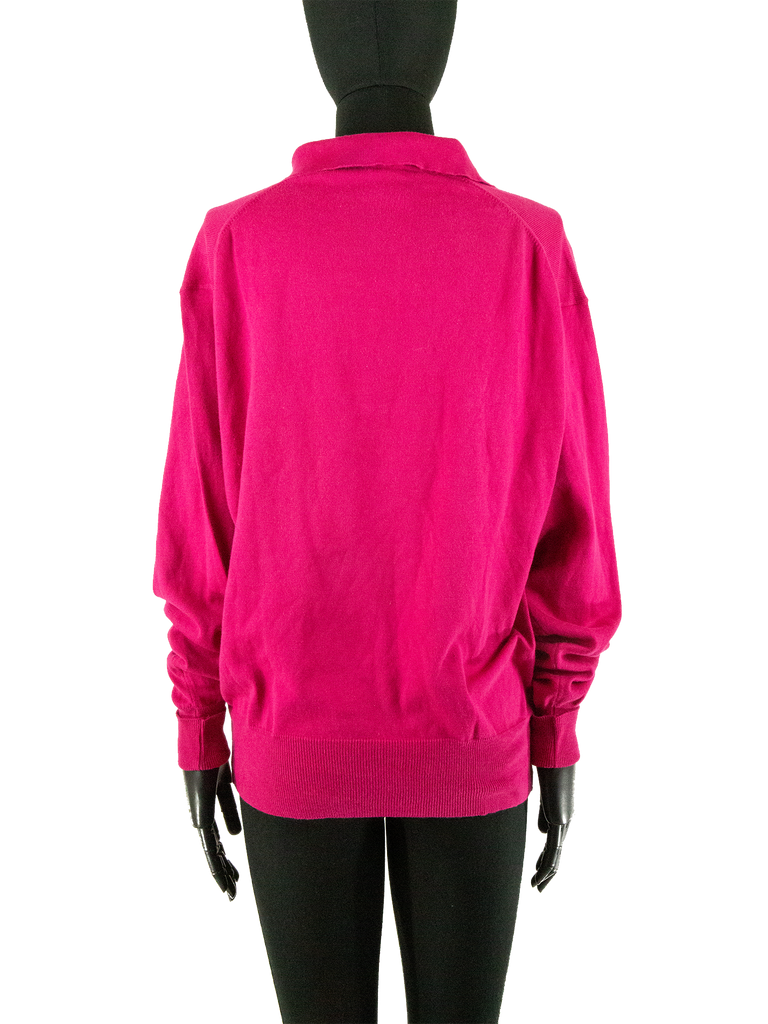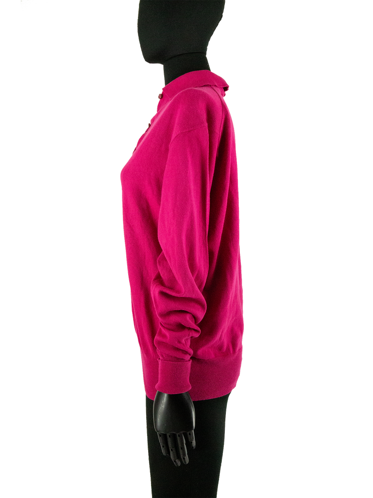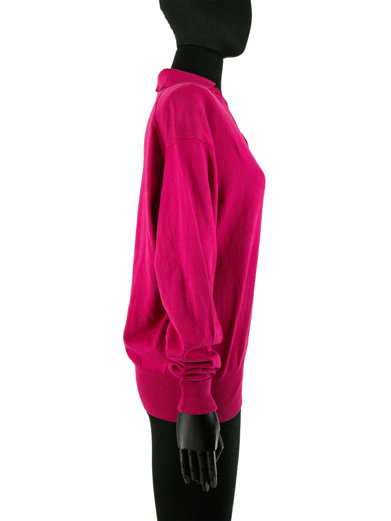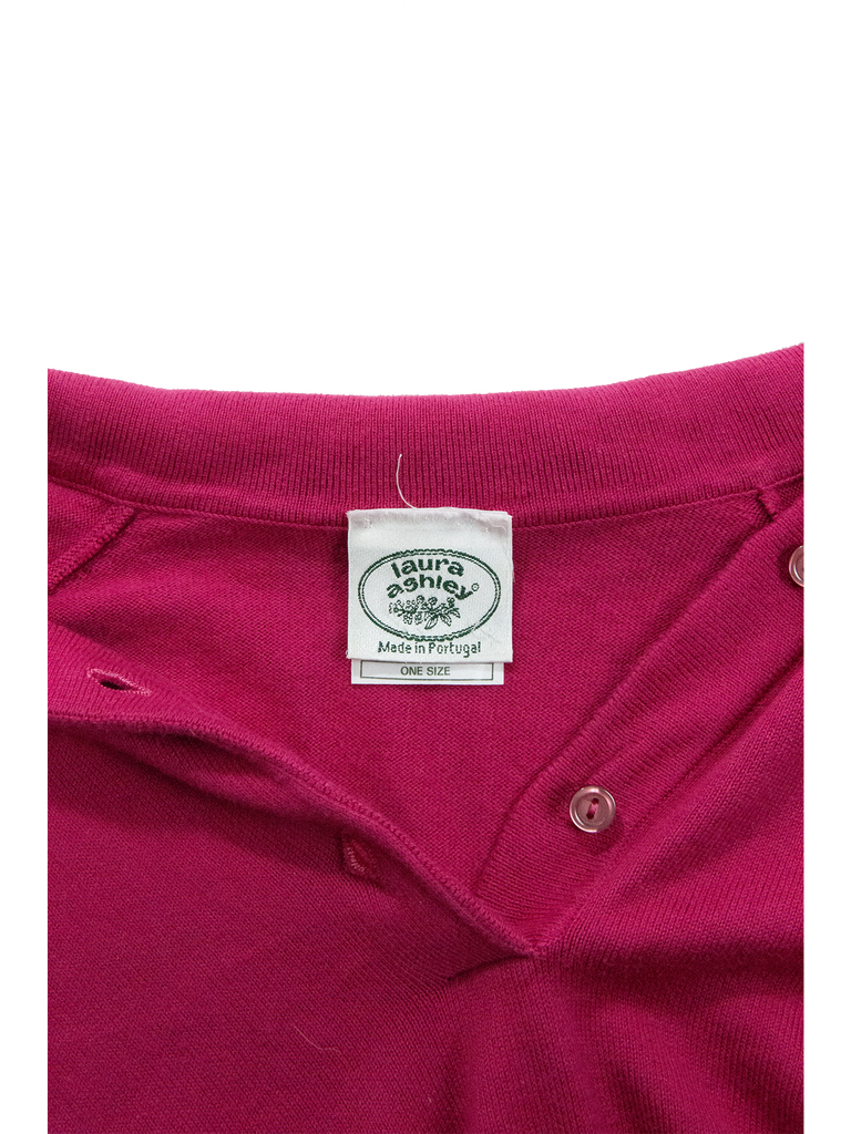 A bright fuchsia Laura Ashley cotton polo shirt in a slouchy fit. This polo shirt is one size so is designed to fit a vast variety of different sizes. With buttons up to the collar in the same colour with a pearlescent effect. The elasticised band at the hem falls asymmetrically around the body to hug the figure whilst also maintaining the oversized slouchy effect